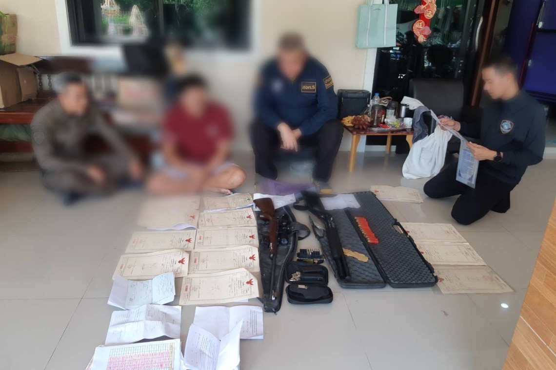 เมื่อวันที่ 23 เม.ย. พล.ต.ท.วรวัฒน์ วัฒน์นครบัญชา ผบช.สอท. ได้สั่งการให้ พล.ต.ต.ภูมิพัฒน์ ภัทรศรีวงษ์ชัย ผบก.สอท.5 พ.ต.อ.ฐาปกรณ์ หนุมาศ ผกก.3 บก.สอท.5 พ.ต.อ.ธีระ เชื้อสุวรรณ ผกก.4 บก.สอท.5 พร้อมเจ้าหน้าที่ตำรวจ กก.3 บก.สอท.5 นำหมายค้นศาลจังหวัดทุ่งสง ที่ 124/2567 ลง 20 เมษายน 2567 ค้นบ้านใน หมู่ 7 ตำบลควนกรด อำเภอทุ่งสง จังหวัดนครศรีธรรมราช จับกุมตัวนายเจริญ (สงวนนามสกุล) อายุ 37 ปี พร้อมของกลางโทรศัพท์มือถือ 3 เครื่อง ไอแพด 1 เครื่อง โฉนดที่ดิน จำนวนมาก หนังสือรับรองการหาประโยชน์ พร้อมเอกสารสัญญากู้ยืมเงินชื่อ รถจักรยานยนต์ 7 คัน อาวุธปืน ขนาด 9 มม. 1 กระบอก เครื่องกระสุนปืน ขนาด 9 มม. โพยการจดรายการหวยใต้ดิน สมุดจดรายการหวย