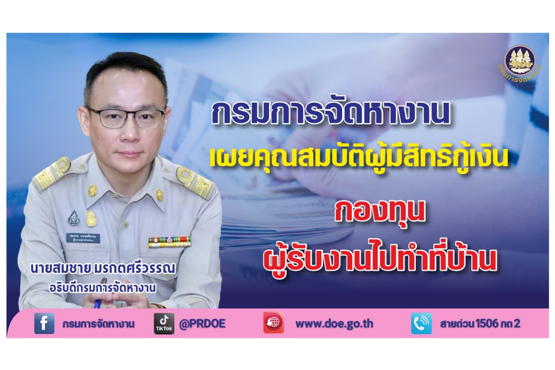 นายสมชาย มรกตศรีวรรณ อธิบดีกรมการจัดหางาน เปิดเผยว่า ขณะนี้มีผู้ให้ความสนใจกู้ยืมเงินกองทุนเพื่อผู้รับงานไปทำที่บ้านและสอบถามขอกู้ยืมเงินภายใต้เงื่อนไข ดอกเบี้ย 0% เข้ามาเป็นจำนวนมาก กรมการจัดหางานจึงขอประชาสัมพันธ์แนวทางการกู้ยืมเงินเพื่อให้ผู้รับงานไปทำที่บ้านซึ่งเป็นแรงงานอิสระ สามารถกู้ยืมเป็นทุนหมุนเวียนสำหรับไปซื้อวัตถุดิบและอุปกรณ์ในการผลิตหรือขยายการผลิต เพื่อสร้างอาชีพ สร้างรายได้ให้กับผู้รับงานไปทำที่บ้าน ซึ่งผู้ที่ต้องการขึ้นทะเบียนเป็นผู้รับงานไปทำที่บ้านต้องมีสัญชาติไทย อายุ 20 ปีขึ้นไป มีสถานที่ที่รับงานไปทำที่บ้านเป็นหลักแหล่ง กรณีเป็นกลุ่มบุคคลต้องมีสมาชิกกลุ่มไม่น้อยกว่า 5 คน (มีผู้นำกลุ่ม) และต้องไม่เป็นสมาชิกกลุ่มผู้รับงานฯกลุ่มอื่น โดยสามารถเตรียมเอกสารหลักฐานสำเนาบัตรประจำตัวประชาชน ติดต่อได้ที่สำนักงานจัดหางานจังหวัดทั่วประเทศ