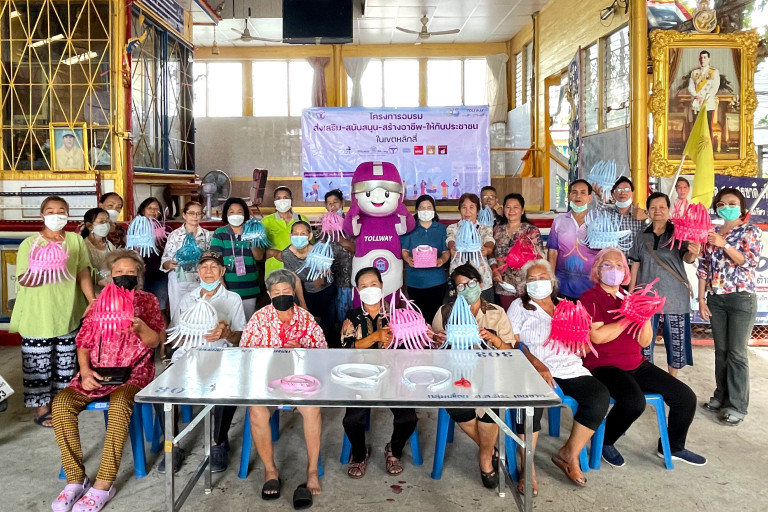 โครงการ Tollway Better Way การอบรมส่งเสริมสนับสนุนสร้างอาชีพให้กับประชาชนเขตหลักสี่และเขตดอนเมือง หนึ่งในแนวทางความรับผิดชอบต่อสังคม ในการร่วมแก้ปัญหาสังคม ชุมชน สิ่งแวดล้อม และส่งเสริมสนับสนุนการพัฒนาคุณภาพชีวิต ให้สามารถประกอบอาชีพเสริมเพื่อเพิ่มรายได้ให้แก่ตนเองและครอบครัว ‘พลาดิสัย ใจทัศกุล’ ผู้จัดการแผนกสื่อสารองค์กรและกิจกรรมเพื่อสังคม เล่าว่า ได้ประสานงานฝ่ายพัฒนาชุมชนและสวัสดิการสังคมกับเขตนำร่อง 2 เขต ได้แก่เขตหลักสี่ 15 ชุมชนและเขตดอนเมือง 16 ชุมชน ใกล้เคียงกับพื้นที่ดำเนินการของบริษัทฯ กลุ่มเป้าหมายผู้สูงอายุในชุมชน วิชาชีพที่เปิดฝึกอบรมครั้งนี้ ได้แก่ สานตระกร้าพลาสติก เบเกอรี่และอาหารว่าง งานเพ้นท์ ผ้ามัดย้อม ยาหม่องสมุนไพร เครื่องดื่มกาแฟสด โดยได้จัดหาวิทยากรผู้เชี่ยวชาญจากศูนย์ฝึกอาชีพกรุงเทพมหานคร มาฝึกสอน ผู้ที่ซื้อหรือได้รับผลิตภัณฑ์ไปจากบริษัทฯ มั่นใจได้ถึงการควบคุมคุณภาพของสินค้า’ ในระหว่างการฝึกอบรม พี่ ป้า น้า อา สมาชิกในชุมชน และเพื่อนร่วมหลักสูตร ต่างตั้งอกตั้งใจฟังและลงมือปฏิบัติภายใต้บรรยากาศการเรียนรู้ ที่สนุกสนาน หลายท่านบอกกับผู้เขียนว่า รู้สึกมีความสุขมากกว่าอยู่บ้านเฉยๆ นอกจากจะได้งาน ได้ความรู้ ได้รายได้แล้ว ยังได้กระชับมิตรกับเพื่อนบ้านที่มาร่วมโครงการนี้ด้วย