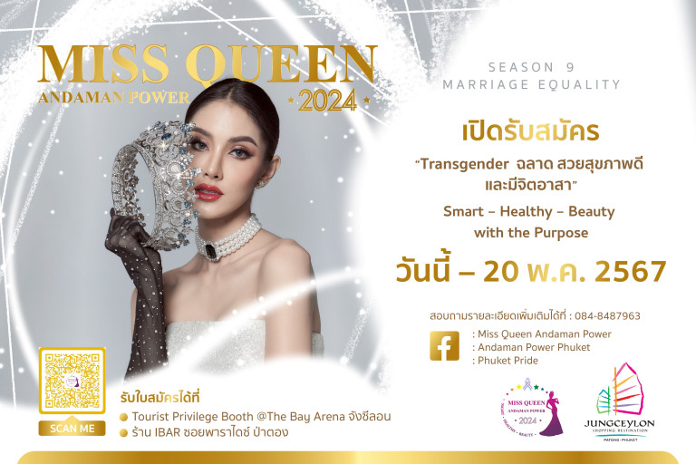 การประกวด Miss Queen Andaman Power 2024 พร้อมเปิดเวทีรับสาวๆ TG จากทุกจังหวัดทั่วทั้งประเทศ ออกมาแสดงความสามารถอย่างสร้างสรรค์ ภายใต้แนวคิด “ฉลาด สวย สุขภาพดี และมีจิตอาสา” ชิงเงินรางวัลมูลค่ารวมกว่า 100,000 บาท โดยผู้ที่สนใจสามารถขอรับใบสมัครได้ตั้งแต่วันนี้ ถึงวันที่ 20 พ.ค. 67 ที่ Tourist Privilege Booth โซนเดอะเบย์ ศูนย์การค้าจังซีลอน ป่าตอง ภูเก็ต และร้าน IBAR ซอยพาราไดซ์ ป่าตอง หรือติดตามข้อมูลและเงื่อนไขการรับสมัครได้ที่ Facebook: Miss Queen Andaman Power หรือสอบถามรายละเอียดเพิ่มเติมที่ 084-848-7963