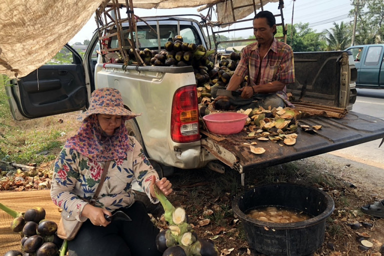 สอบถามนายสงกรานต์ อุบลลา อายุ 56 ปี พ่อค้า ต.โพนทอง อ.เมือง จ.กาฬสินธุ์ ระบุว่า เดิมตนและภรรยา มีอาชีพรับจ้างทั่วไป แต่ในช่วงหน้าร้อนจะหยุดงานรับจ้าง และหันมายึดอาชีพตะเวนปีนเก็บลูกตาลสดอ่อนธรรมชาติ ตามไร่นา ที่ตนได้จองกับเจ้าของไว้ตั้งแต่ปีที่แล้ว ก่อนจะนำมาปลอกเปลือก ตั้งร้านเปิดหลังรถกระบะขายริมทางบริเวณนี้เป็นประจำทุกปีในช่วงที่ผลิตลูกตาลออกผลมากๆประมาณปลายเดือนมีนาคมถึงปลายเดือนพฤษภาคม