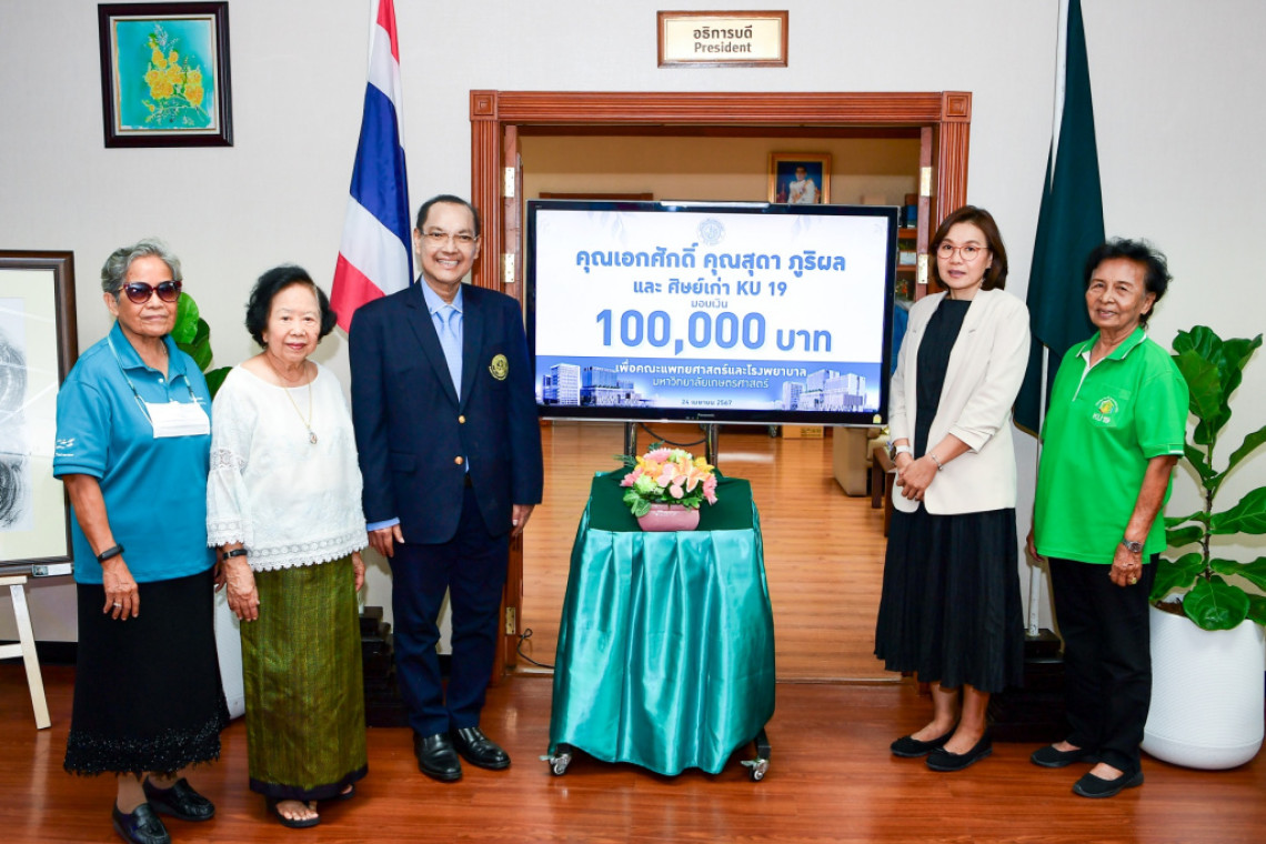ดร.จงรัก วัชรินทร์รัตน์ อธิการบดีมหาวิทยาลัยเกษตรศาสตร์ รับมอบเงินบริจาคเพื่อสนับสนุนคณะแพทยศาสตร์และโรงพยาบาลมหาวิทยาลัยเกษตรศาสตร์ จำนวน 100,000 บาท จากคุณเอกศักดิ์ - คุณสุดา ภูริผล และนิสิตเก่า KU 19 โอกาสนี้ ผศ.ดร.นุชนาถ มั่งคั่ง รองอธิการบดีฝ่ายการเงินและทรัพย์สิน ร่วมเป็นสักขีพยาน เมื่อวันที่ 24 เมษายน 2567 ณ อาคารสารนิเทศ 50 ปี มหาวิทยาลัยเกษตรศาสตร์