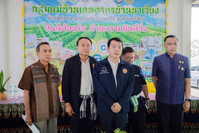 โดยการลงพื้นที่ครั้งนี้ ได้ไปจุดแรกที่ศาลาประชาคมบ้านคุ้ม หมู่ที่ 9 ตำบลคูเมือง อำเภอมหาชนะชัย จังหวัดยโสธร เพื่อพบปะชาวบ้านและรับฟังปัญหาความเดือดร้อนของประชาชน พร้อมลงพื้นที่ไปดูถนนเพื่อขอรับการสนับสนุนงบประมาณในการซ่อมแซมถนนให้สัญจรไปมาได้อย่างสะดวก จากนั้นเดินทางไปจุดที่ 2 คือกลุ่มแม่บ้านวิสาหกิจชุมชนบ้านนาเวียง ตำบลกู่จาน อำเภอคำเขื่อนแก้ว จังหวัดยโสธร ซึ่งแปรรูปและจำหน่ายผลผลิตถั่วลิสงมานานกว่า 25 ปี ปัจจุบันดำเนินการภายใต้ชื่อ “ถั่วดินเวียงทอง” มีสมาชิก 100 ราย พื้นที่ปลูกถั่วลิสง 585 ไร่ มีผลผลิตประมาณปีละ 146 ตัน และในวันนี้สมาชิกลุ่มต้องการรับการสนับสนุนเครื่องมือและอุปกรณ์เพื่อเพิ่มปริมาณผลผลิตการแปรรูปถั่วลิสงให้ทันต่อความต้องการของตลาด พร้อมลงพื้นที่ไปสำรวจการปลูกถั่วลิสงแปลงใหญ่ ส่วนจุดที่ 3 ไปที่โครงการขุดลอกคลองไผ่ตอนบน ตำบลเหล่าไฮ อำเภอคำเขื่อนแก้ว จังหวัดยโสธร ซึ่งเป็นแหล่งน้ำตามธรรมชาติที่ตื้นเขินเนื่องจากการทับถมกันของตะกอนดินและการพังทลายของดิน ไม่สามารถกักเก็บน้ำไว้ใช้อย่างเพียงพอตลอดปี