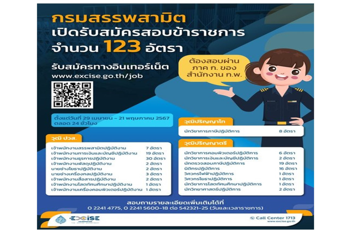 กรมสรรพสามิตประกาศผ่านเฟซบุ๊ก กรมสรรพสามิต Excise Department ระบุว่า กรมสรรพสามิตเปิดรับสมัครสอบข้าราชการ จำนวน 123 อัตรา (ต้องสอบผ่านภาค ก. ของสำนักงาน ก.พ.) รับสมัครทางอินเทอร์เน็ต www.excise.go.th/job ตั้งแต่วันที่ 29 เมษายน – 21 พฤษภาคม 2567 ตลอด 24 ชั่วโมง สอบถามรายละเอียดเพิ่มเติมได้ที่ 0-2241-4775,0-2241-5600-18 ต่อ 542321-25 (วันและเวลาราชการ)