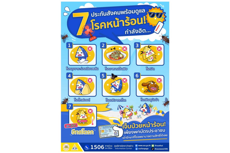 นายบุญสงค์ ทัพชัยยุทธ์ เลขาธิการสำนักงานประกันสังคม กระทรวงแรงงาน กล่าวถึงสภาวะอากาศร้อนทะลุ 40 องศา สำนักงานประกันสังคมออกมาเตือนโรคร้ายที่มากับหน้าร้อน คือ โรคอุจจาระร่วงเฉียบพลัน โรคอาหารเป็นพิษ โรคบิด โรคไทฟอยด์ โรคอหิวาตกโรค และโรคพิษสุนัขบ้าหรือโรคกลัวน้ำ จะเห็นได้ว่าโรคที่ต้องระวังในช่วงอากาศร้อนนี้ โดยส่วนใหญ่จะเป็นโรคจากการรับประทานอาหาร และน้ำดื่ม ดังนั้น เพื่อเป็นการป้องกันโรคดังกล่าว สำนักงานประกันสังคมจึงขอแนะนำให้ท่านดูแลสุขภาพให้แข็งแรง ด้วยการเลือกรับประทานอาหารที่ปรุงสุกใหม่ กินร้อน ช้อนกลาง ล้างมือ และควรดื่มน้ำสะอาดในปริมาณที่เพียงพอ สำหรับอีกโรค คือ โรคลมแดด หรือฮีทสโตรก ภัยร้ายที่ก่อให้เกิดอันตรายถึงชีวิตของลูกจ้าง ผู้ประกันตนที่ทำงานกลางสภาพอากาศที่ร้อนระอุ เป็นเวลานานอย่างหลีกเลี่ยงไม่ได้ โดยอาการเบื้องต้นที่สังเกตได้คือ อ่อนเพลียเมื่อยล้า ปวดศีรษะ หน้ามืด ตัวร้อนจัด รูขุมขนปิด เหงื่อไม่ออก ตัวสั่น หายใจเร็ว กล้ามเนื้อเป็นตะคริว บางรายอาจมีอาการชักกระตุก และหมดสติ หากเกิดอาการดังกล่าวให้รีบหลบเข้าที่ร่ม ใช้ผ้าชุบน้ำเย็นเช็ดตามตัว หรือวางถุงน้ำแข็งที่คอ รักแร้ และขาหนีบ แล้วรีบให้คนรอบข้างนำส่งโรงพยาบาลโดยเร็ว