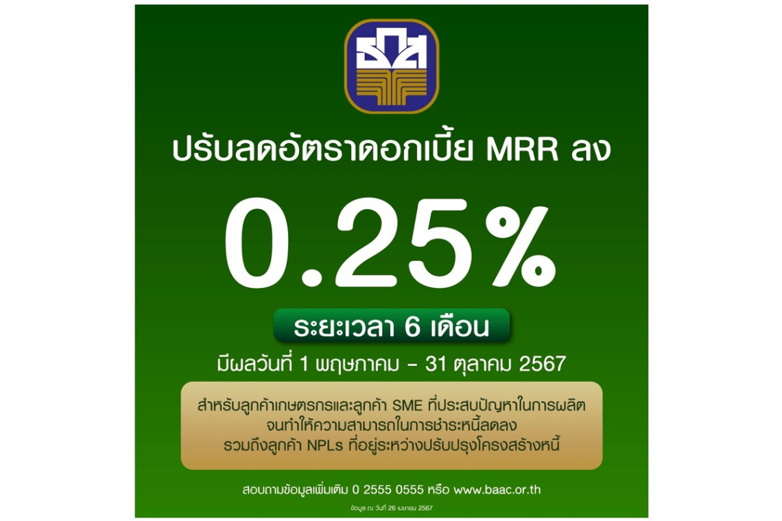 โดย ธ.ก.ส. ตระหนักถึงความจำเป็นในการดำเนินงานตามนโยบายและแนวทางที่สอดคล้องกับสมาคมสถาบันการเงินของรัฐ จึงได้ปรับลดอัตราดอกเบี้ยเงินกู้ MRR ลงร้อยละ 0.25 เป็นระยะเวลา 6 เดือน ให้กับเกษตรกรลูกค้ากลุ่มเปราะบางและ SMEs ที่ประสบปัญหาในการผลิต จนทำให้ความสามารถในการชำระหนี้ลดลง รวมถึงลูกหนี้ NPLs ที่อยู่ระหว่างปรับปรุงโครงสร้างหนี้ โดยมีลูกค้าที่จะได้รับประโยชน์กว่า 1.2 ล้านบัญชี ทั้งนี้ เพื่อลดภาระค่าใช้จ่าย และสนับสนุนการฟื้นตัวของลูกค้าในช่วงภาวะเศรษฐกิจยังฟื้นตัวไม่เต็มที่และไม่ทั่วถึง โดยมีผลตั้งแต่ 1 พ.ค. - 31 ต.ค. 67