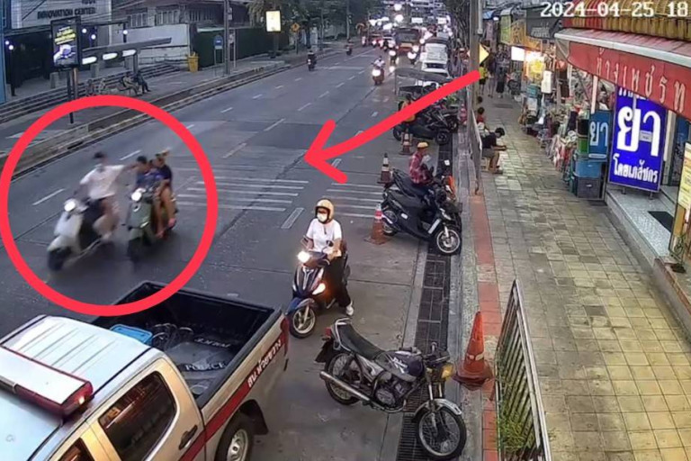 กล้องวงจรปิดจับภาพคนร้าย สวมเสื้อยืดคอกลมสีขาว กางเกงขาสั้นสีดำ ใส่แมสปิดบังใบหน้า ขี่จยย.ยี่ห้อ ฮอนด้า รุ่นจิออโน่ สีขาวดำ ไม่สวมแผ่นป้ายทะเบียน บริเวณหน้าตลาดห้วยขวาง ถนนประชาสงเคราะห์ แขวงดินแดง เขตห้วยขวาง ทำทีขับรถเข้ามาเทียบเคียงรถ จยย.ผู้เสียหาย ก่อนทำการกระชากสร้อยคอผู้เสียหายขณะขับรถจยย.กลับบ้าน ทำให้เสียหลักเกือบล้ม ก่อนขับหลบหนี ก่อนชาวบ้านระแวกนั้นช่วยกันขับตามไล่จับ