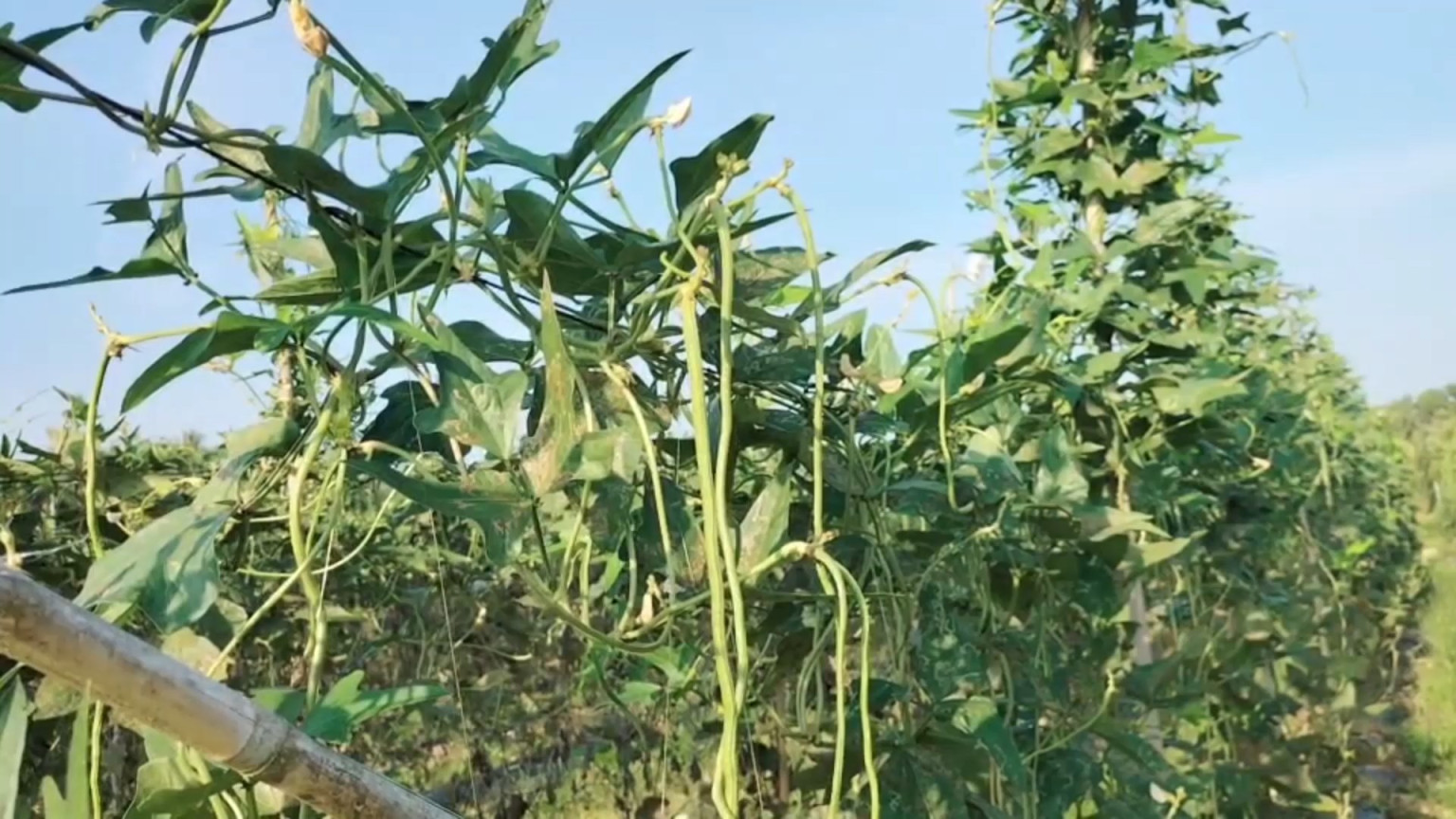 โดยในรอบนี้ได้ปลูกถั่วฝักยาวไว้ประมาณ 1 ไร่ และเก็บผลผลิตมาแล้วประมาณ 1 เดือน ช่วงแรกผลผลิตออกมากจะช่วยเก็บผลผลิตทุกวัน และช่วงนี้ผลผลิตเริ่มน้อยลงจะเก็บวันเว้นวัน จะเก็บผลผลิตช่วงเช้าโดยใช้มือเด็ดขั้วผลแล้วมัดเป็นกำๆกำละขนาด 1 กำมือ