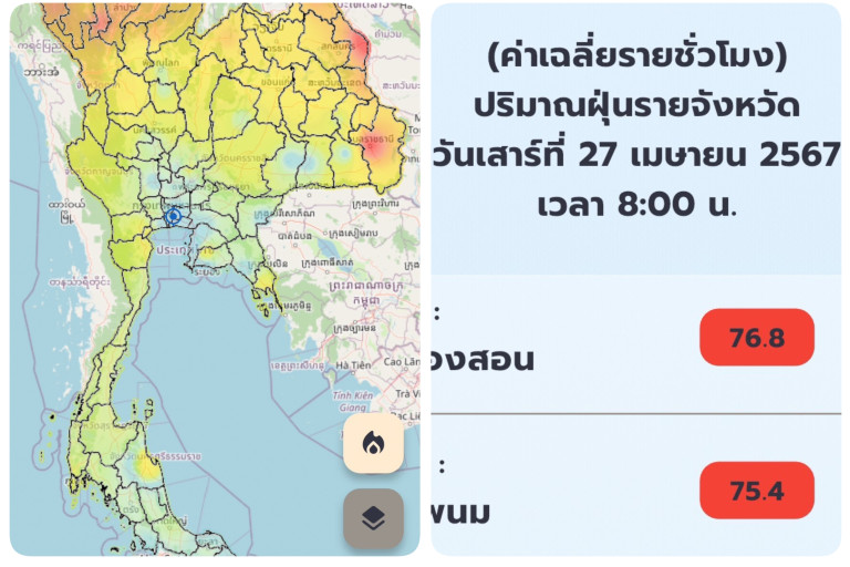 กระทรวงการอุดมศึกษา วิทยาศาสตร์ วิจัยและนวัตกรรม (อว.) โดยสำนักงานพัฒนาเทคโนโลยีอวกาศและภูมิสารสนเทศ (องค์การมหาชน) หรือ GISTDA ร่วมกับสำนักงานการวิจัยแห่งชาติ, กรมควบคุมมลพิษ, มหาวิทยาลัยเกษตรศาสตร์ และมหาวิทยาลัยเชียงใหม่ เกาะติดสถานการณ์ฝุ่น PM 2.5 แบบรายชั่วโมง ด้วยข้อมูลจากดาวเทียมผ่านแอปพลิเคชั่น “เช็คฝุ่น” เมื่อเวลา 08.00 น. ของวันที่ 27 เมษายน 2567 พบ 2 จังหวัดมีค่าคุณภาพอากาศเกินมาตรฐานในระดับสีแดงที่มีผลกระทบต่อสุขภาพและระบบทางเดินหายใจ คือ #แม่ฮ่องสอน 76.8 ไมโครกรัม #นครพนม 75.4 ไมโครกรัม ส่วนอีก 21 จังหวัดโซนภาคเหนือ และภาคตะวันออกเฉียงเหนือคุณภาพอากาศยังเกินเกณฑ์มาตรฐานในระดับสีส้ม