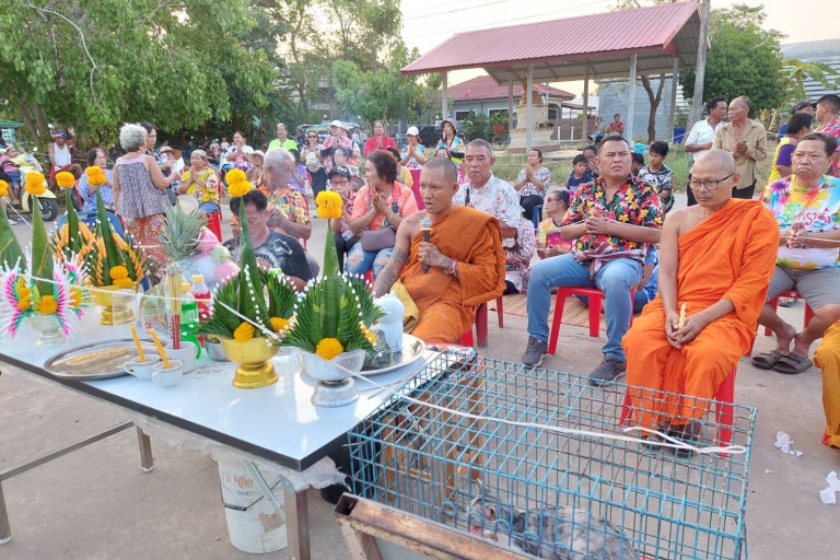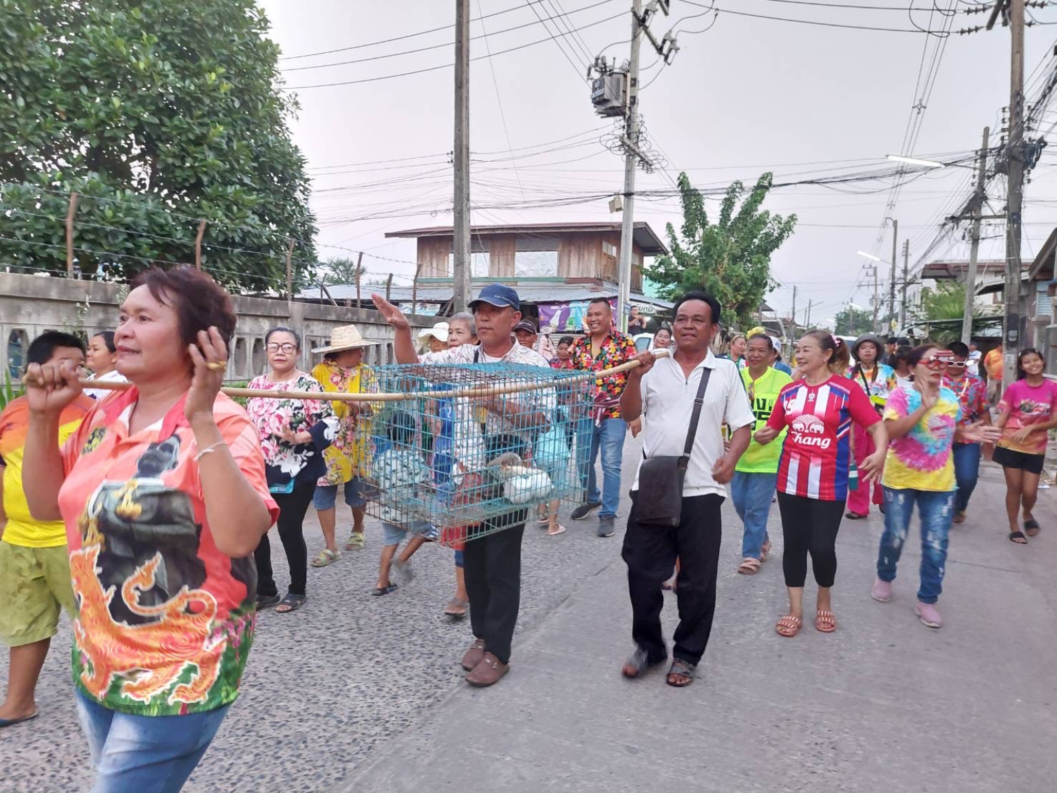 โดยผู้สูงอายุในหมู่บ้านร่วมประกอบพิธีอันเชิญเทวดา เพื่อให้ช่วยฝนตกลงด้วยการตั้งขบวนแห่ที่จะใช้รูปปั้นแมวปูนปั้นมาใช้ใส่กรงหรือเข่ง มีไม้คานหาม เพื่อที่จะนำแมวแห่ขอฝนให้ประชาชนที่อยู่ในหมู่บ้านได้ใช้น้ำสาดใส่แมวที่ปัจจุบันจะใช้เป็นตุ๊กตาแมวปลอมแทน ซึ่งเดิมแมวที่รวมในขบวนโบราณจะใช้แมวที่มีชีวิต เพราะปัจจุบันไม่อยากให้มีการทารุณกรรมสัตว์ได้ ตามความเชื่อของชาวไทยอีสานที่นี่มายาวนานแต่โบราณ