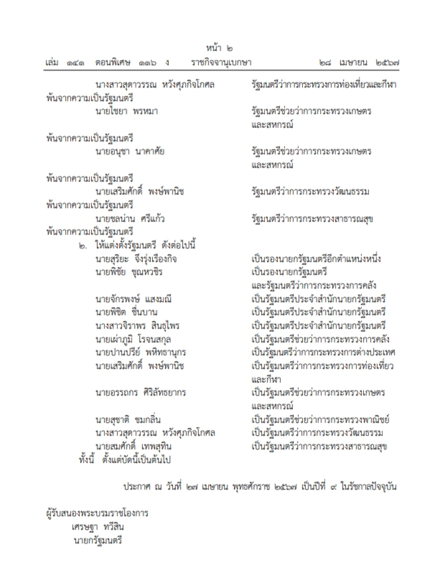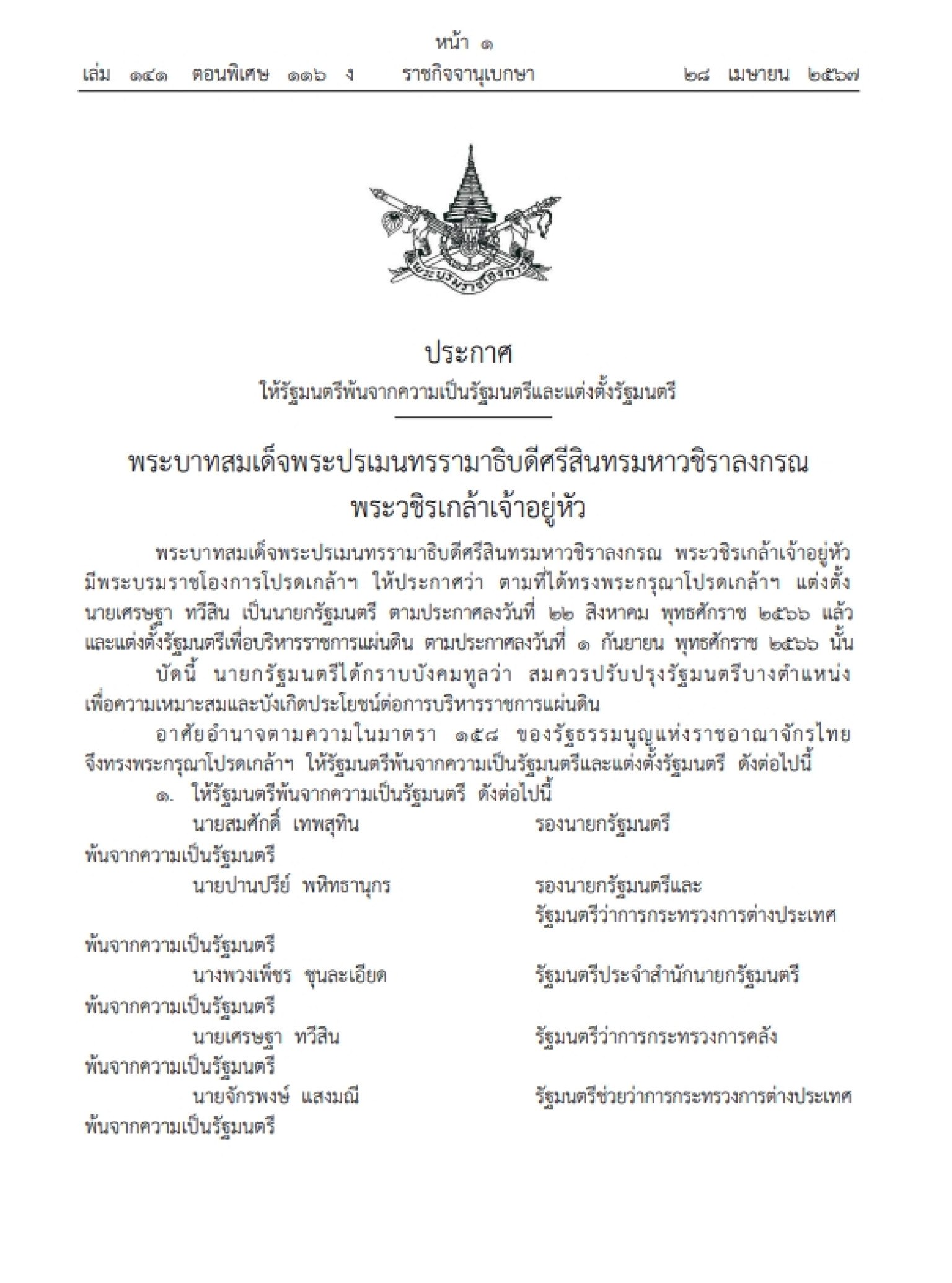 วันที่ 28 เมษายน 2567 เวบไซต์ราชกิจจานุเบกษา ราชกิจจานุเบกษา ลงประกาศเรื่อง ให้รัฐมนตรีพ้นจากความเป็นรัฐมนตรีและแต่งตั้งรัฐมนตรี พระบาทสมเด็จพระปรเมนทรรามาธิบดีศรีสินทรมหาวชิราลงกรณ พระวชิรเกล้าเจ้าอยู่หัว มีพระบรมราชโองการโปรดเกล้าฯ ให้ประกาศว่า ตามที่ได้ทรงพระกรุณาโปรดเกล้าฯ แต่งตั้ง นายเศรษฐา ทวีสิน เป็นนายกรัฐนตรี ตามประกาศลงวันที่ 2 สิงหาคม พุทธศักราช 2566 แล้ว และแต่งตั้งรัฐมนตรีเพื่อบริหารราชการเผ่นดิน ตามประกาศลงวันที่ 3 กันยายน พุทธศักราช2566 นั้น