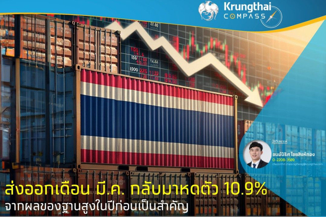 มูลค่าการส่งออกเดือน มี.ค. หดตัว 10.9%YoY จากผลของฐานในปีก่อนเป็นสำคัญ โดยติดลบในรอบ 8 เดือน และเป็นการหดตัวสูงสุดในรอบ 15 เดือน อย่างไรก็ตามการหดตัวที่สูงในเดือน มี.ค. เป็นผลจากฐานสูงในช่วงเดือนเดียวกันของปีก่อนเป็นสำคัญ ส่งผลให้สินค้าสำคัญหลายรายการหดตัว อาทิ ทองคำ ยานพาหนะ เครื่องใช้ไฟฟ้า และผลิตภัณฑ์ยาง เป็นต้น ประกอบกับปัญหาสภาพภูมิอากาศทำให้การส่งออกผลไม้หดตัว เป็นต้น อย่างไรก็ตาม สินค้าสำคัญบางรายการหดตัวเนื่องจากการส่งออกที่ยังฟื้นตัวได้ช้า ได้แก่ เม็ดพลาสติก เคมีภัณฑ์ และเครื่องอิเล็กทรอนิกส์โดยเฉพาะฮาร์ดดิสก์ไดร์ฟ ซึ่งคาดว่าสินค้าเหล่านี้ยังคงเป็นปัจจัยกดดันการส่งออกในระยะข้างหน้า