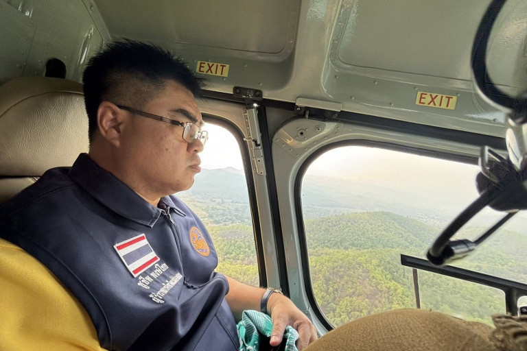 ผู้ว่าราชการจังหวัดแม่ฮ่องสอน ขึ้นเฮลิคอปเตอร์ตรวจพื้นที่ป่า ที่พบจุดความร้อน เพื่อป้องกันแก้ไขปัญหาหมอกควันไฟป่า ในพื้นที่อำเภอเมือง อำเภอปางมะผ้า และอำเภอปาย