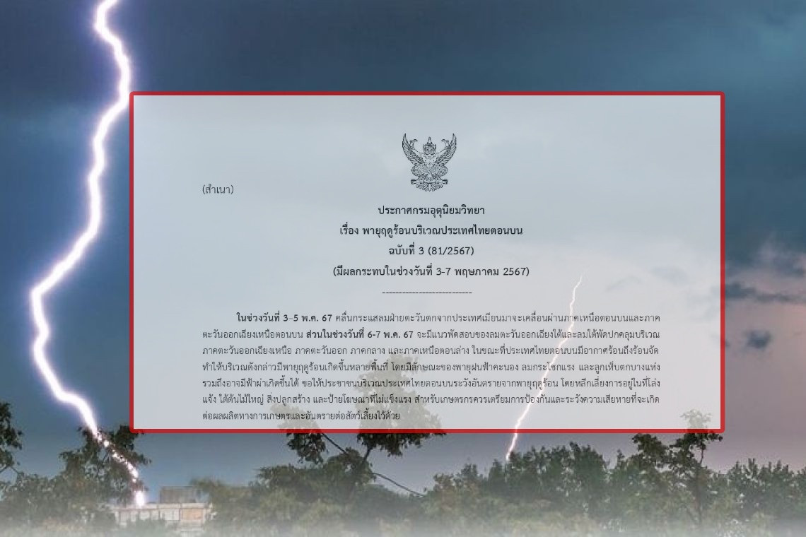 วันที่ 2 พฤษภาคม พ.ศ. 2567 นางสาวกรรวี สิทธิชีวภาค อธิบดีกรมอุตุนิยมวิทยา ออกประกาศกรมอุตุนิยมวิทยา เรื่อง พายุฤดูร้อนบริเวณประเทศไทยตอนบน ฉบับที่ 3 (81/2567) (มีผลกระทบในช่วงวันที่ 3-7 พฤษภาคม 2567)