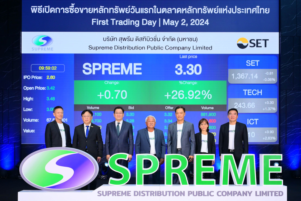 นายภานุวัฒน์ ขันธโมลีกุล ประธานเจ้าหน้าที่บริหาร บริษัท สุพรีม ดิสทิบิวชั่น จำกัด (มหาชน) หรือ SPREME เปิดเผยว่า หุ้น SPREME ได้เข้าซื้อขายในตลาดหลักทรัพย์แห่งประเทศไทย (SET) กลุ่มอุตสาหกรรม เทคโนโลยีสารสนเทศและการสื่อสาร เมื่อวันที่ 2 พฤษภาคม 2567 เป็นวันแรก ได้รับความสนใจจากนักลงทุนทั่วไปอย่างดีเยี่ยม โดยมีราคาเปิดซื้อขายที่ 3.42 บาท เพิ่มขึ้น 0.82 บาท หรือ 31.54% เทียบจากราคาไอพีโอที่ 2.60 บาท/หุ้น สะท้อนถึงความเชื่อมั่นของนักลงทุนที่มีต่อปัจจัยพื้นฐานของบริษัทฯ ในฐานะผู้นำธุรกิจ System Integrator ในกลุ่มอุตสาหกรรมเทคโนโลยีสารสนเทศและการสื่อสาร ซึ่งเป็นเมกะเทรนด์ของโลกและมีโอกาสเติบโตได้อีกมาก ตามแนวทางการพัฒนาด้านการศึกษาของประเทศ และการพัฒนาประเทศเข้าสู่รูปแบบ เมืองอัจฉริยะ (Smart City) และความปลอดภัยสาธารณะ (Public Safety)