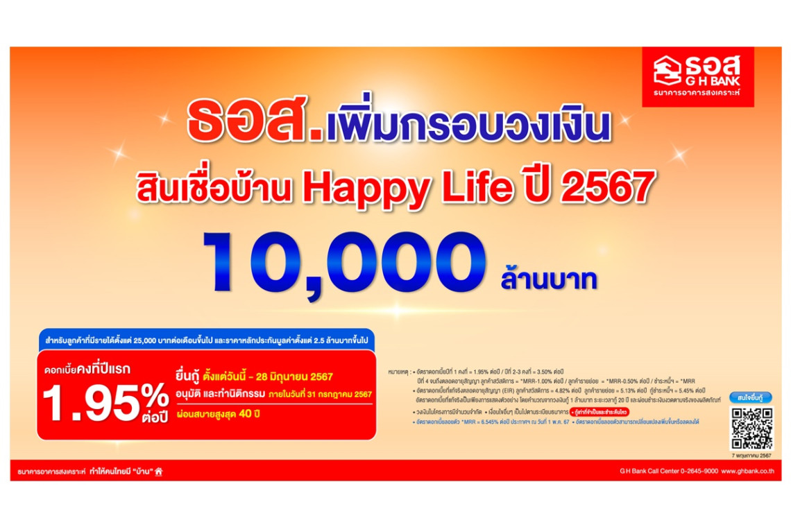 นายกมลภพ วีระพละ กรรมการผู้จัดการ ธนาคารอาคารสงเคราะห์ (ธอส.) เปิดเผยว่า หลังจากที่ธนาคารจัดทำสินเชื่อบ้าน Happy Life ปี 2567 กรอบวงเงิน 10,000 ล้านบาท สำหรับการซื้อที่อยู่อาศัยที่มีราคาตั้งแต่ 2.5 ล้านบาทขึ้นไป โดยจะได้รับอัตราดอกเบี้ยปีที่ 1 คงที่เท่ากับ 1.95% ต่อปี, ปีที่ 2-3 คงที่เท่ากับ 3.50% ต่อปี