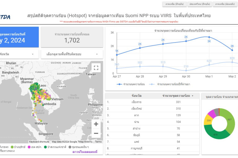 กระทรวงการอุดมศึกษา วิทยาศาสตร์ วิจัยและนวัตกรรม (อว.) โดยสำนักงานพัฒนาเทคโนโลยีอวกาศและภูมิสารสนเทศ (องค์การมหาชน) หรือ GISTDA เผยข้อมูลจากดาวเทียมซูโอมิ เอ็นพีพี (Suomi NPP) และจากดาวเทียมอีกหลายดวง เมื่อวันที่ 2 พฤษภาคม 2567 ไทยพบจุดความร้อนทั้งประเทศ 1,702 จุด ข้อมูลจากดาวเทียมยังระบุอีกว่าจุดความร้อนที่เกิดขึ้นส่วนใหญ่พบในพื้นที่ป่าอนุรักษ์ 637 จุด ตามด้วยพื้นที่ป่าสงวนแห่งชาติ 616 จุด พื้นที่เกษตร 208 จุด เขต สปก. 134 จุด ชุมชนและพื้นที่อื่นๆ 91 จุด และพื้นที่ริมทางหลวง 16 จุด สำหรับจังหวัดที่พบจำนวนจุดความร้อนมากที่สุด คือ #เชียงราย 331 จุด