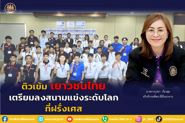 กรมพัฒนาฝีมือแรงงาน จัดสัมมนาให้เตรียมความพร้อมเยาวชน ผู้เชี่ยวชาญ ล่าม และทีมฝึกเยาวชน ก่อนเข้าเก็บตัวฝึกซ้อมเพื่อเข้าร่วมการแข่งขันฝีมือแรงงานนานาชาติ ครั้งที่ 47 (WorldSkills Lyon 2024) กำหนดจัดแข่งขันระหว่างวันที่ 3 - 17 กันยายน 2567 ณ ศูนย์การประชุมและแสดงสินค้ายูเร็กซ์โป (Eurexpo) เมืองลียง สาธารณรัฐฝรั่งเศส ไทยส่งเยาวชน 22 คน ใน 19 สาขาการแข่งขัน