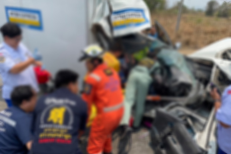 หนุ่มใหญ่ขับรถส่งอาหารสัตว์ เสยท้ายรถพ่วง 22 ล้อ ติดภายใน กู้ภัยเร่งช่วยชีวิตใช้เวลากว่า 30 นาที ก่อนนำตัวส่ง ร.พ.
