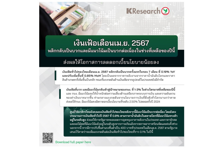 ศูนย์วิจัยกสิกรไทยระบุ เงินเฟ้อทั่วไปของไทยเดือน เม.ย. 2567 พลิกกลับเป็นบวกครั้งแรกในรอบ 7 เดือน ที่ 0.19% YoY และหากเทียบกับเดือนก่อนหน้า ปรับเพิ่มขึ้นที่ 0.85% MoM โดยเป็นผลมาจากราคาน้ำมันเชื้อเพลิงที่ปรับสูงขึ้นตามสถานการณ์ราคาน้ำมันดิบในตลาดโลกประกอบกับมีการทยอยปรับขึ้นราคาขายปลีกน้ำมันดีเซลในประเทศ อีกทั้งราคาสินค้าเกษตรโดยเฉพาะผักสดและผลไม้สดปรับสูงขึ้นเนื่องจากสภาพอากาศที่ร้อนจัดส่งผลให้มีผลผลิตออกสู่ตลาดน้อยลง ในขณะที่หากหักราคาอาหารสดและพลังงานออก เงินเฟ้อพื้นฐานเดือน เม.ย.2567 ทรงตัวจากเดือนก่อนหน้าโดยอยู่ที่ 0.37% YoY สะท้อนว่าการปรับขึ้นของเงินเฟ้อเป็นผลจากราคาพลังงานและสินค้าเกษตรเป็นหลัก ขณะที่แรงกดดันด้านเงินเฟ้อจากอุปสงค์ในประเทศยังมีจำกัด ทั้งนี้ในช่วง 4 เดือนแรกของปีนี้ เงินเฟ้อทั่วไปเฉลี่ยของไทยอยู่ที่ -0.54% YoY และเงินเฟ้อพื้นฐานเฉลี่ยของไทยอยู่ที่ 0.42% YoY