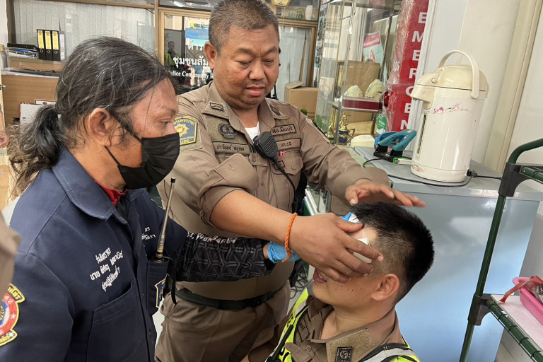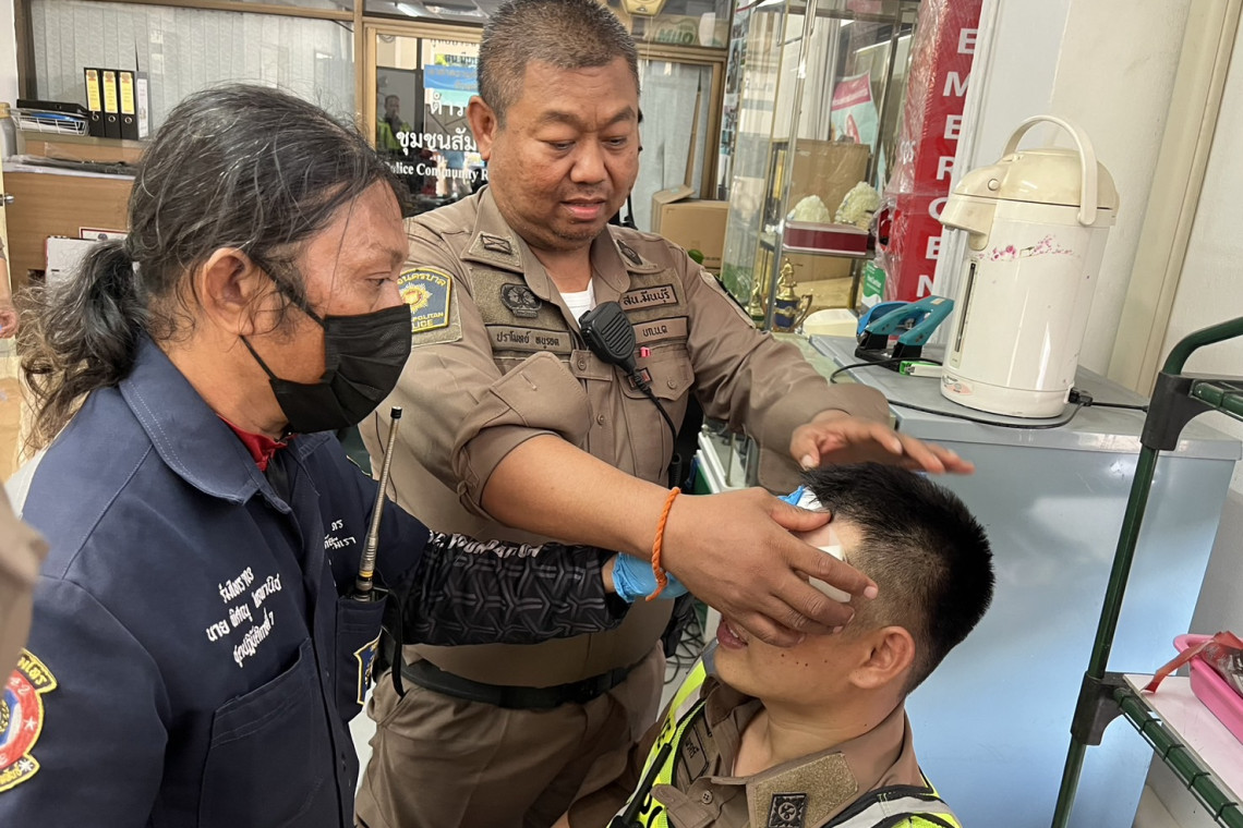 สายตรวจมีนบุรี ระงับเหตุชายคลั่งทำร้ายคน คว้าท่อนไม้ฟาดหัวตำรวจแตกเย็บ 5 เข็ม ควบคุมตัวตรวจพบฉี่ม่วง เมายาอาละวาด