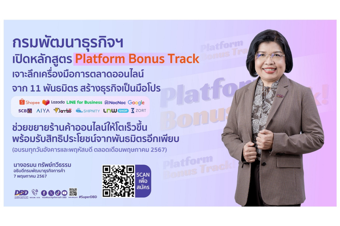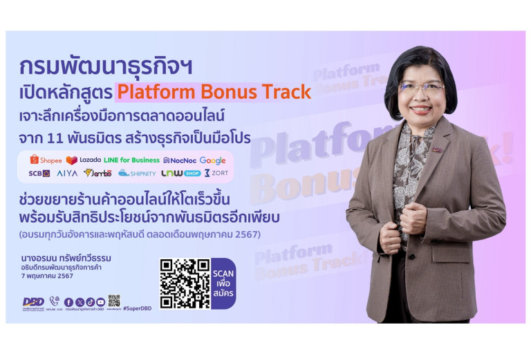 ทั้งนี้เพื่อเป็นการสร้างความรู้ด้านการทำตลาดออนไลน์อย่างต่อเนื่อง กรมฯ จึงได้จัดอบรมหลักสูตร Platform Bonus Track ผ่านระบบออนไลน์ Zoom โดยเป็นความร่วมมือกับพันธมิตรด้าน e-Commerce 11 แพลตฟอร์ม ได้แก่ Shopee, Lazada, LINE for Business, Google, NocNoc, lnwshop, SCB, AIYA, ZORT, SHIPNITY และ JamboLive ที่จะช่วยนำเสนอเครื่องมือการตลาดออนไลน์แบบเจาะลึกเมื่อเรียนจบแล้วสามารถนำมาใช้ต่อยอดกับธุรกิจได้จริงทันที ประกอบไปด้วย 12 หลักสูตร อาทิ หัวข้อเทคนิคจัดการสต๊อกและบริหารร้านค้า พาธุรกิจโตด้วยระบบจัดการร้านค้าออนไลน์ วิทยากรจาก ZORT,หัวข้อขายดี กำไรงาม เพิ่มช่องทางการรับเงินด้วยแอพแม่มณี วิทยากรจาก SCB, หัวข้อโดดเด่นบน Google ด้วย Business Profile ที่จะช่วยสร้างให้ข้อมูลของร้านค้าปรากฎบนโลกออนไลน์ ง่ายต่อการค้นหาและพบเจอจากลูกค้า วิทยากรจาก Google, หัวข้ออัปเดตการตลาดยุค AI First ใช้เครื่องมืออย่างไรให้ปัง เป็นผู้ให้บริการระบบบริหารงานลูกค้า การตอบข้อซักถามที่สะดวก รวดเร็วด้วยเทคโนโลยีทำให้งานบริหารหลังร้านง่ายยิ่งขึ้น วิทยากรจาก AIYA และหัวข้อเพิ่มยอดขายและสร้างลูกค้าประจำด้วยการใช้กลยุทธ์ไลฟ์ วิทยากรจาก JamboLive ซึ่งเป็นผู้ให้บริการระบบบริหาร Chat ผ่านการ Live ขายสินค้าบนช่องทางโซเชียลมีเดีย ทั้งนี้ ผู้สนใจที่ผ่านหลักสูตร OMG#4 หรือร้านค้าออนไลน์ทั่วไปสามารถเลือกเรียนหลักสูตร Platform Bonus Track ได้ตามหัวข้อที่สนใจ กำหนดจัดอบรมทุกวันอังคารและพฤหัสบดี ตลอดเดือนพฤษภาคม 2567 จำนวน 7 วัน เริ่มต้นตั้งแต่วันพฤหัสบดีที่ 9 พฤษภาคม 2567
