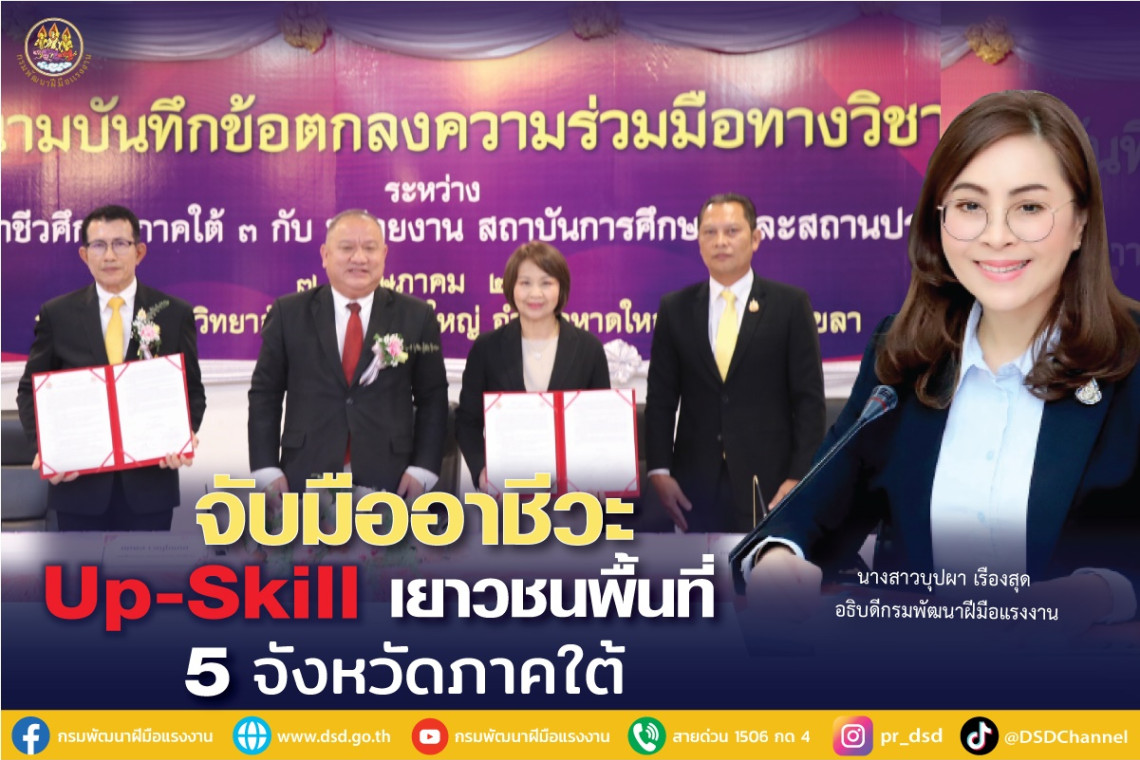 นางสาวบุปผา เรืองสุด อธิบดีกรมพัฒนาฝีมือแรงงงาน เปิดเผยว่า นักเรียน นักศึกษา เป็นกลุ่มแรงงานเป้าหมายที่กรมเร่งดำเนินการพัฒนาทักษะฝีมือเพื่อให้มีความพร้อมในการทำงานหลังจากจบการศึกษา โดยเน้นนักเรียน นักศึกษาในชั้นปีสุดท้าย ซึ่งนักเรียนอาชีวะได้รับการศึกษาในด้านอาชีพ ตลาดแรงงานมีความต้องการรับเข้าทำงานเป็นจำนวนมาก นอกจากนี้กระทรวงแรงงาน และกระทรวงศึกษาธิการ ได้ทำความร่วมมือส่งเสริมการศึกษาและการมีงานทำให้แก่นักเรียน นักศึกษา มาตั้งแต่ปี 2565 เพื่อลดปัญหาการขาดแคลนแรงงานและยกระดับทักษะฝีมือให้ได้มาตรฐาน และเพื่อเน้นย้ำความร่วมมือ จึงมอบหมายให้ผู้ตรวจราชการกรมร่วมลงนามความร่วมมือกับสถาบันการอาชีวศึกษาภาคใต้ 3 เพื่อร่วมกันฝึกอบรมให้นักเรียนอาชีวะใน 5 จังหวัดภาคใต้ได้แก่ สงขลา สตูล ยะลา ปัตตานี และนราธิวาส โดยจะร่วมกันให้การสนับสนุนการฝึกอบรม และทดสอบมาตรฐานฝีมือแรงงานแห่งชาติ รวมทั้งส่งเสริมการจัดตั้งศูนย์ทดสอบมาตรฐานฝีมือแรงงาน การขึ้นทะเบียนเป็นผู้ประเมินความรู้ความสามารถ และการจัดตั้งศูนย์ประเมินความรู้ความสามารถตามความต้องการของตลาดแรงงาน โดยทั้งสองหน่วยงานจะประสานรายละเอียดการดำเนินงานร่วมกันในระดับพื้นที่ต่อไป