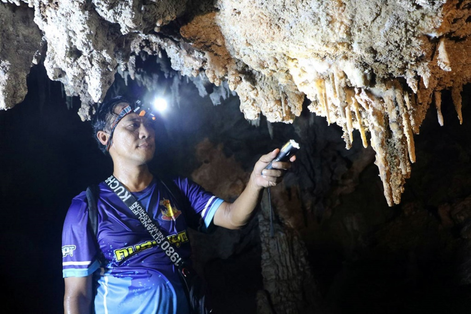 จากนั้นก็จะพบกับสภาพเป็นห้องโถงค่อนข้างใหญ่ มีก้อนหินโผล่ขึ้นมาจากดินหลากหลายขนาด เมื่อใช้ไฟฉายสาดส่องไปตามผนังถ้ำพบว่าลักษณะมีหินงอกหินย้อยห้อยระย้า เป็นรูปทรงคลายหยดเทียนเต็มพื้นผนังถ้ำประกายงดงามแปลกตา บางจุดคล้ายรูปหยดน้ำเป็นแท่ง ๆ คลายรังผึ้ง เมื่อนำไฟส่องใกล้ ๆ จะมีลักษณะระยิบระยับคล้ายกากเพชร ด้านในยังแบ่งเป็นห้อง ๆ มีหินงอกหินย้อยลักษณะเป็นดอกขาวโพลนคล้ายปุยนุ่น เป็นเกล็ดหิมะ บางจุดกำลังงอกเป็นแท่งเล็ก ๆ เปล่งประกายสวยงามเมื่อกระทบกับแสงไฟ ด้านล่างในส่วนที่ลึกลงไปดูคลายกับเป็นธารน้ำไหลลงสู่ใต้พื้นดิน แต่เนื่องจากอยู่ในช่วงหน้าแล้ง จึงทำให้น้ำแห้งเห็นดิน