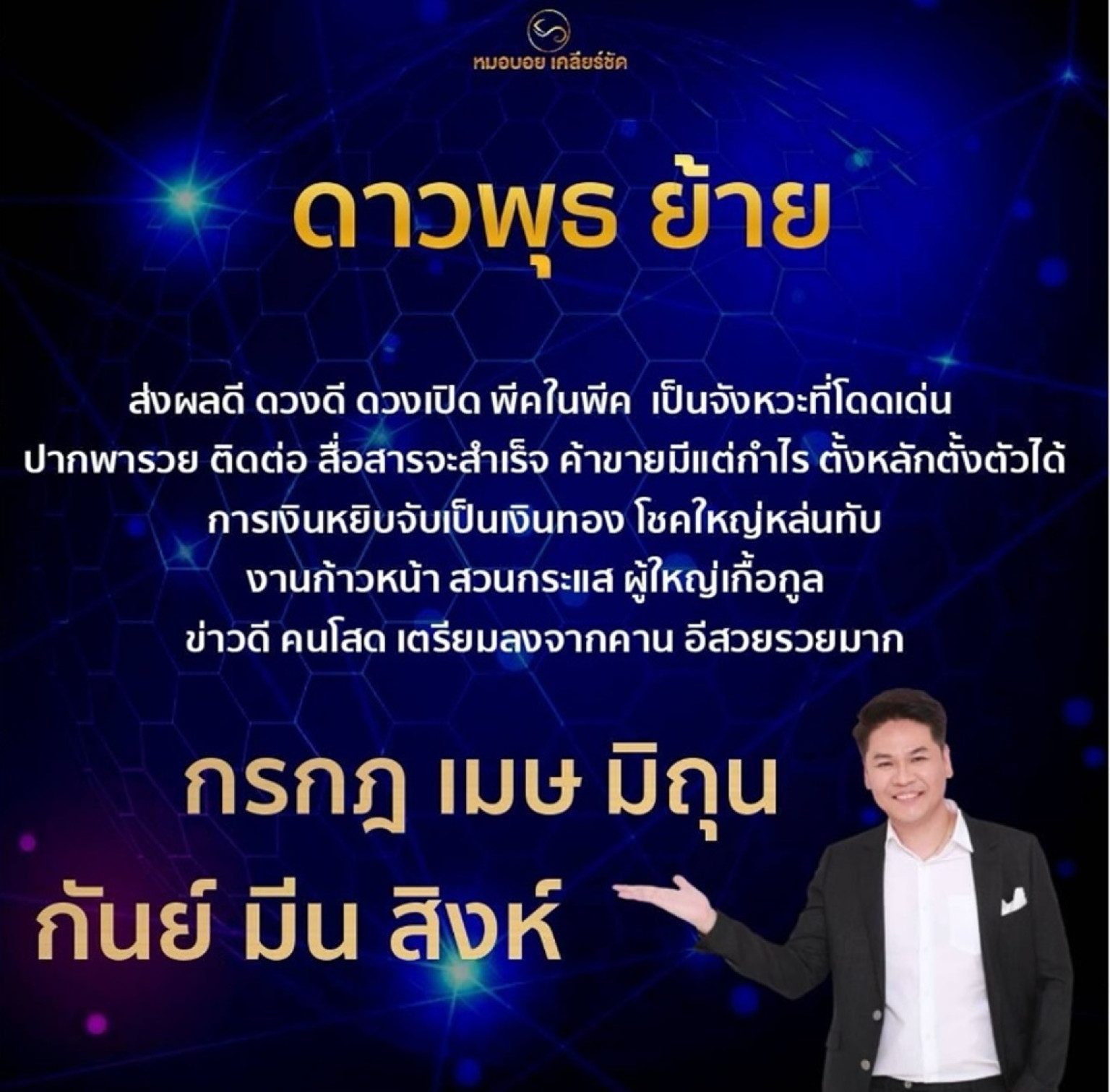 วันที่ 7 พ.ค.67 "หมอบอย เคลียร์ชัด" นักพยากรณ์ชื่อดัง โพสต์ข้อความผ่านอินสตาแกรม morboy_clearchad ระบุว่า 6 ราศี ดาวพุธย้าย ส่งผลดี ดวงดี ดวงเปิด พีคในพีค เป็นจังหวะที่โดดเด่น .. การเงินหยิบจับเป็นเงินทอง โชคใหญ่หล่นทับ งานก้าวหน้า ผู้ใหญ่เกื้อกูล คนโสด เตรียมลงจากคาน ได้แก่ กรกฎ เมษ มิถุน กันย์ มีน สิงห์