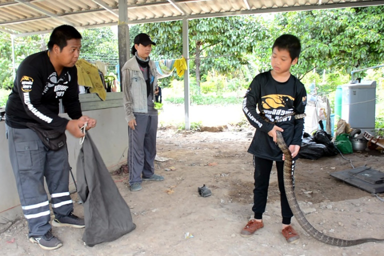 ที่เกิดเหตุเป็นบ้านพักอยู่กลางสวนผลไม้ เลขที่ 19 /3 พบมี ทีมพิทักษ์งู 2 คน ทราบชื่อต่อมาคือ นาย สามารถ เขี้ยวสิงห์ และ ด.ช.ธัญพิสิษฐ์ เขี้ยวสิงห์ อายุ 10 ปี คุณพ่อและลูกชาย กำลังช่วยกันใช้อุปกรณ์เป็นตะขอเหล็ก ไล่ต้อน เกี่ยวจับงูสิงตัวใหญ่ ที่กำลังเลื้อยหลบไปตามซอกกองข้าวของบริเวณข้างบ้าน จนสามารถจับตัวงูสิงออกมาในที่กว้างได้สำเร็จ