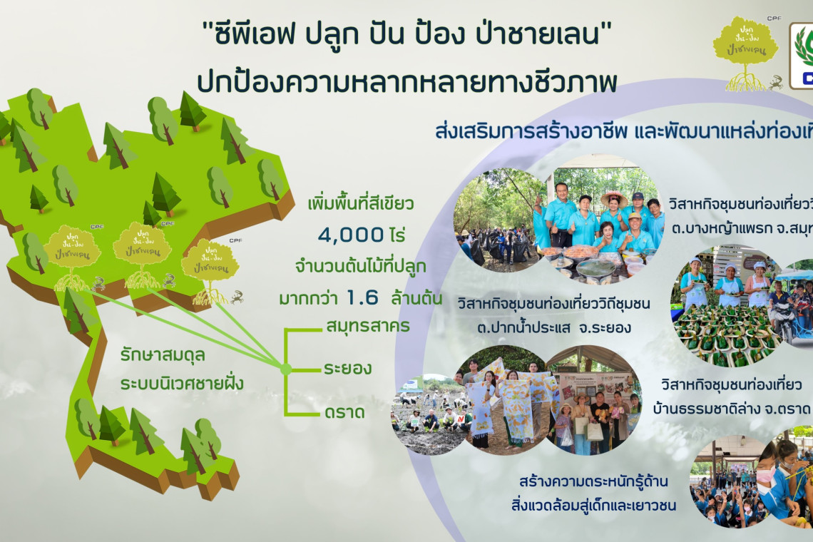 ตั้งแต่ปี 2557 จนถึงปัจจุบัน ซีพีเอฟดำเนินโครงการ "ซีพีเอฟ ปลูก ปัน ป้อง ป่าชายเลน"อนุรักษ์ ฟื้นฟู และปลูกป่าใหม่เพิ่มเติมจำนวน 4,000 ไร่ คิดเป็นจำนวนต้นไม้ที่ปลูกมากกว่า 1.6 ล้านต้น ในพื้นที่ยุทธศาสตร์ 5 จังหวัด คือ ระยอง สมุทรสาคร ชุมพร สงขลา และพังงา