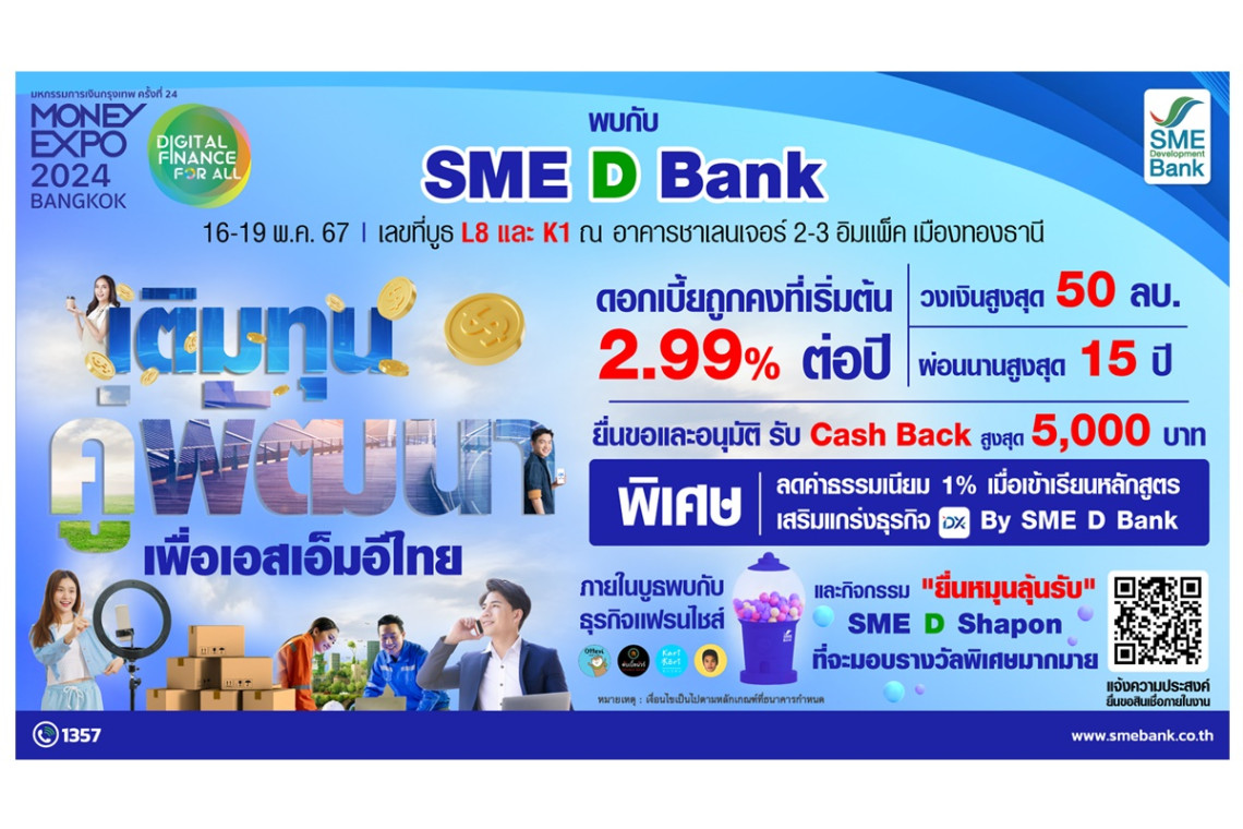 ธนาคารพัฒนาวิสาหกิจขนาดกลางและขนาดย่อมแห่งประเทศไทย (ธพว.) หรือ SME D Bank จัดบริการตอบครบความต้องการเอสเอ็มอีไทย ในงาน มหกรรมการเงินกรุงเทพ ครั้งที่ 24 (MONEY EXPO 2024 BANGKOK) ระหว่างวันที่ 16-19 พฤษภาคม 2567 ณ ชาเลนเจอร์ 2-3 อิมแพ็ค เมืองทองธานี หมายเลขที่บูธ L8 และ K1 ยกทัพจัดเต็มโปรโมชั่น “เติมทุนคู่พัฒนา” ด้วยผลิตภัณฑ์สินเชื่อครอบคลุมทุกกลุ่มธุรกิจ ไฮไลท์คือ สินเชื่อ SME Refinance อัตราดอกเบี้ยถูก ปีแรกคงที่ 2.99% ต่อปี เมื่อรีไฟแนนซ์มาแล้ว ขอกู้เพิ่มได้ วงเงินกู้สูงสุด 50 ล้านบาท ใช้ได้ทั้งลงทุน ขยาย หมุนเวียน เสริมสภาพคล่อง ผ่อนสบายนานสูงสุด 15 ปี ควบคู่โปรโมชั่นด้าน “การพัฒนา” ผ่านแพลตฟอร์ม “DX by SME D Bank” (dx.smebank.co.th) รวบรวมบริการและสิทธิประโยชน์จากหน่วยงานภาครัฐ เอกชน และสถาบันการศึกษา อัพสกิลเสริมศักยภาพเอสเอ็มอีไทยสู่ยุคดิจิทัล ครบถ้วนในจุดเดียว