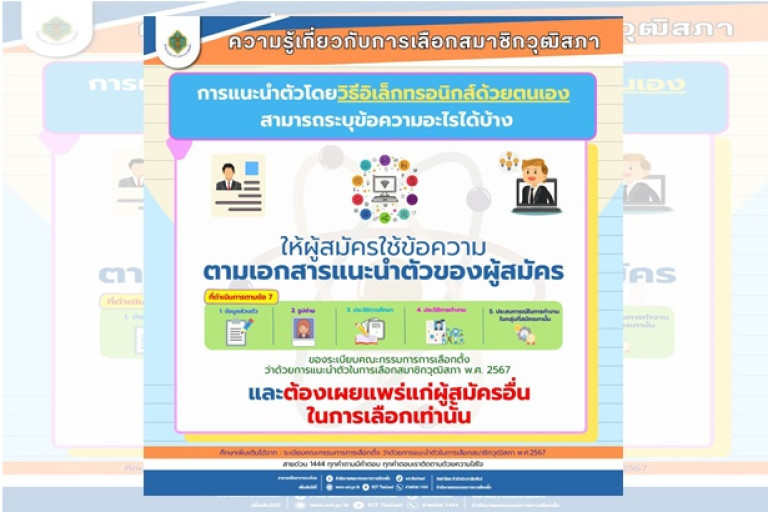 นอกจากนี้ยังเผยแพร่ภาพอินโฟกราฟฟิก การแนะนำตัวโดยวิธีอิเล็กทรอนิกส์ด้วยตนเองว่าสามารถระบุข้อความอะไรได้บ้าง โดยกำหนดให้ผู้สมัครใช้ข้อความตามเอกสารแนะนำตัวของผู้สมัคร ที่ต้องดำเนินการตามข้อ 7 ของระเบียบ กกต. ว่าด้วยการแนะนำตัวในการเลือกสมาชิกวุฒิสภา 2567 คือ 1.ข้อมูลส่วนตัว 2 รูปถ่าย 3 ประวัติการศึกษา 4 ประวัติการทำงาน และถ้าประสบการณ์ในการทำงานในกลุ่มที่สมัครเท่านั้นพร้อมเน้นย้ำว่า ต้องเผยแพร่แก่ผู้สมัครอื่นในการเลือกเท่านั้น