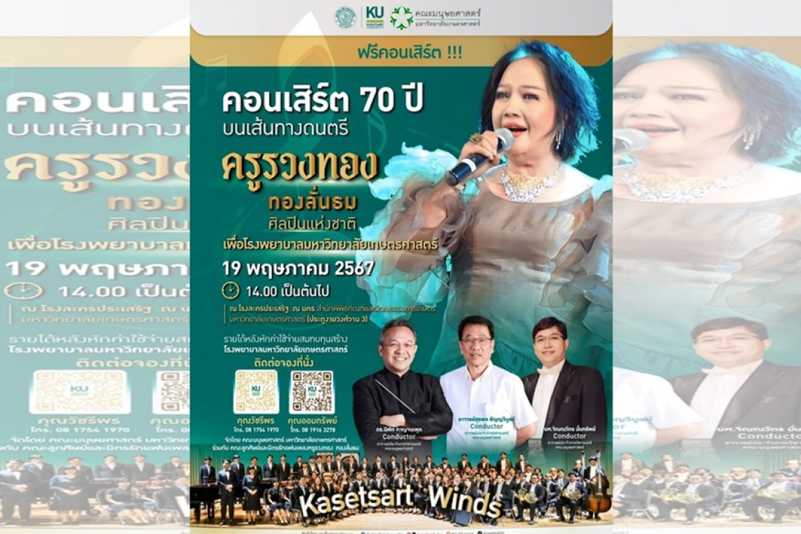 คณะมนุษยศาสตร์ มหาวิทยาลัยเกษตรศาสตร์ ร่วมกับคณะลูกศิษย์และมิตรรักแฟนเพลงครูรวงทอง ทองลั่นธม จัดคอนเสิร์ต 70 ปี บนเส้นทางดนตรี ครูรวงทอง ทองลั่นธม (ศิลปินแห่งชาติ) เพื่อโรงพยาบาลมหาวิทยาลัยเกษตรศาสตร์ ในรูปแบบฟรีคอนเสิร์ต หรือไม่เสียค่าใช้จ่ายสำหรับเข้าชม ในวันอาทิตย์ที่ 19 พฤษภาคม 2567 เวลา 14.00 -17.00 น. ณ โรงละครประเสริฐ ณ นคร สำนักพิพิธภัณฑ์และวัฒนธรรมการเกษตร มหาวิทยาลัยเกษตรศาสตร์ (ประตูงามวงศ์วาน 3 หรือ สถานีรถไฟฟ้าสายสีแดง ม.เกษตร)