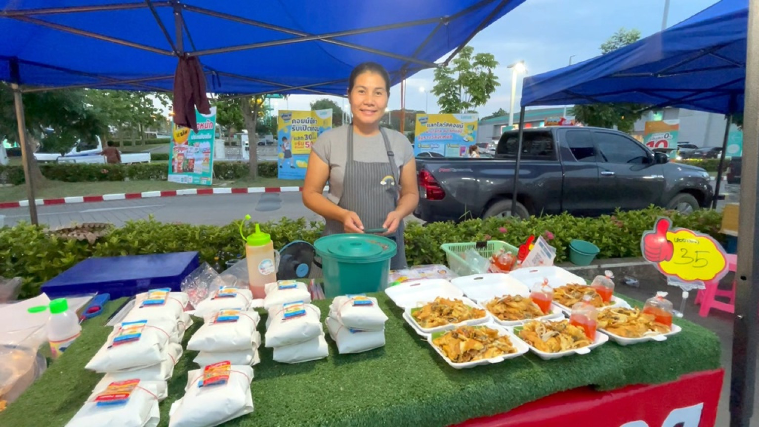 ส่วนวันธรรมดา คุณวิทย์ สามีของตนเอง จะตระเวนขายไปตามตลาดนัดในเขตจังหวัดหนองบัวลำภู เราผัดกันสดๆกระทะต่อกระทะทุกวันร้อนๆ และช่วงศุกร์ - เสาร์ จะมาขายอยู่ที่ลานจอดรถห้างโลตัส ในเขตเทศบาลเมืองหนองบัวลำภู โดยจะขายในช่วงเย็นโดยทางห้างโลตัส ให้ใช้สถานที่โดยเก็บค่าเช่าถูกมากๆ แค่วันละ 50 บาท และถ้าเกิดวันไหนฝนตก ทางโลตัสหนองบัวลำภู ก็จะไม่เก็บค่าเช่า จึงอยากฝากขอบคุณเจ้าของสถานที่มานะที่นี้ด้วยคะ ส่วนผัดไทยหอยทอด 20 น่าจะมีร้านของตนเอง เจ้าเดียวซึ่งขายผัดไทยในราคา 20 บาท ส่วนหอยทอดจะราคา 35 บาท หอยทอดจะปรับราคาขึ้นนิดนึ่ง เพราะเราคัดสรรวัตถุดิบอย่างดี แต่ปริมาณและคุณภาพ ไม่ต้องห่วงรับรองกล่องเดียวอิ่มแน่นอน