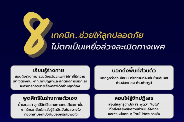 8)พูดคุยกับลูกเรื่องการล่วงละเมิดทางเพศ หาบรรยากาศสบาย ๆ สอนให้ลูกเข้าใจตนเอง และความหมายการล่วงละเมิด สิทธิที่จะปกป้องตัวเอง หากลูกสงสัยจะได้ถามพ่อแม่ได้ตรง ๆ ไม่รู้สึกกดดัน เพื่อที่ลูกเกิดความวางใจและมั่นใจ