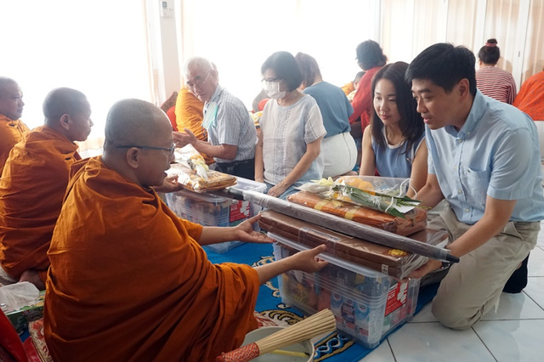 วันที่ 12 พ.ค.67 ที่บ้านพักนายอำเภอบางละมุง ตั้งอยู่ริมถนนสายพัทยา-นาเกลือ เลขที่ 43 ม.5 ต.นาเกลือ อ.บางละมุง จ.ชลบุรี นายวีกิจ มานะโรจน์กิจ นายอำเภอบางละมุง พร้อมด้วย นางสาวรัชดาภรณ์ ธาราสมบัติ นายกกิ่งกาชาดอำเภอบางละมุง จัดพิธีทำบุญพร้อมถวายเพลแด่พระภิกษุสงฆ์ จำนวน 9 รูป เพื่อความเป็นสิริมงคล โดยมี จ่าเอกพิทยาภรณ์ ก่อแก้ว ปลัดอาวุโสอำเภอบางละมุง นำข้าราชการ พนักงานในสังกัดเข้าร่วม สมาชิกกิ่งกาชดอำเภอบางละมุง เข้าร่วมโดยพร้อมเพรียงกัน