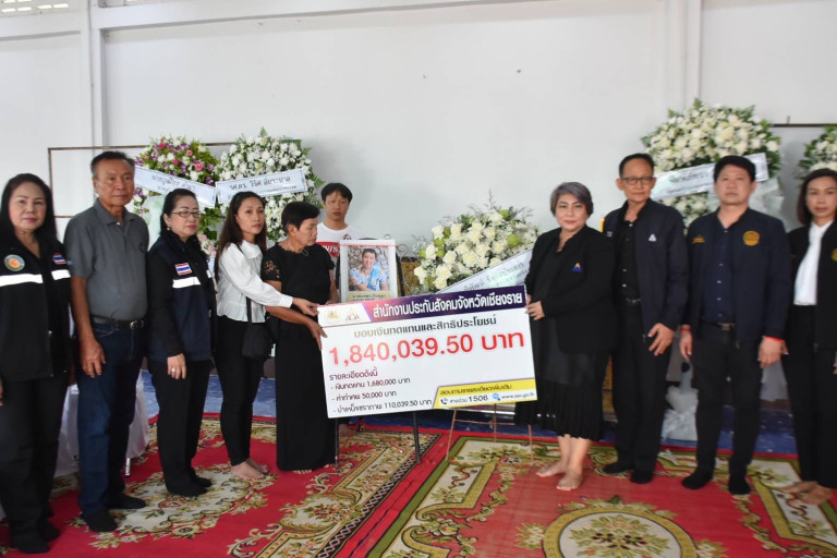 ขณะที่วันเดียวกันนี้ทางเรืออากาศเอกหญิง ศุภพร อยู่วัฒนา ผู้ตรวจราชการกรม สำนักงานประกันสังคม และนายพรชัย พินิจรัตนอนันต์ ประกันสังคมจังหวัดเชียงราย ได้เดินทางไปที่วัดปูแกง ตำบลแม่เย็น อำเภอพาน จังหวัดเชียงราย เพื่อมอบเงินทดแทนและสิทธิประโยชน์จากสำนักงานประกันสังคมให้กับครอบครัวผู้เสียชีวิต โดยแบ่งเป็นเงินทดแทน 1,680,000 บาท ค่าทำศพ 50,000 บาท และบำเหน็จชราภาพ 110,039.50 บาท รวมเป็นเงินทั้งสิ้น 1,840,039.50 บาท (หนึ่งล้านแปดแสนสี่หมื่นสามสิบเก้าบาทห้าสิบสตางค์) อีกทั้งยังเป็นตัวแทนของนายพิพัฒน์ รัชกิจประการ รัฐมนตรีว่าการกระทรวงแรงงาน และนายบุญสงค์ ทัพชัยยุทธ์ เลขาธิการสำนักงานประกันสังคม ส่งมอบพวงหรีดไว้อาลัยและแสดงความห่วงใยต่อครอบครัวผู้เสียชีวิต โดยมี นางปั๋น เรือนมา อายุ 67 ปี มารดา และ น.ส.โสรยา เรือนมา อายุ 35 ปี ภรรยาของผู้เสียชีวิต เป็นผู้รับมอบ
