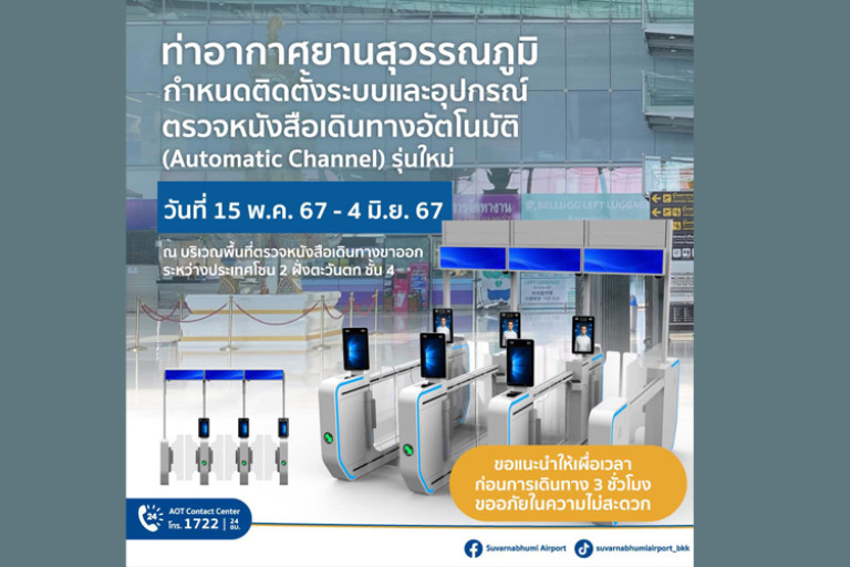 เพจเฟซบุ๊ก Suvarnabhumi Airport โพสต์ข้อความ แจ้ง กำหนดการติดตั้งระบบและอุปกรณ์ตรวจหนังสือเดินทางอัตโนมัติ (Automatic Channel) ระบุว่า...ท่าอากาศยานสุวรรณภูมิ (ทสภ.) กำหนดการติดตั้งระบบและอุปกรณ์ตรวจหนังสือเดินทางอัตโนมัติ (Automatic Channel) รุ่นใหม่เพื่อทดแทนรุ่นเดิม และรื้อถอนเคาน์เตอร์ตรวจหนังสือเดินทางแบบเดิมบางส่วนที่มีเจ้าหน้าที่ตำรวจตรวจคนเข้าเมืองปฏิบัติหน้าที่ตรวจหนังสือเดินทาง (Conventional Counter) เป็นแบบช่องตรวจอัตโนมัติ (Automatic Channel) ทั้งนี้ เพื่อเพิ่มประสิทธิภาพในการให้บริการตรวจหนังสือเดินทางของ ทสภ. ให้มีความคล่องตัวและรวดเร็วมากยิ่งขึ้น โดยในระยะแรกจะดำเนินการบริเวณพื้นที่ตรวจหนังสือเดินทางขาออกระหว่างประเทศโซน 2 ฝั่งตะวันตก ชั้น 4 อาคารผู้โดยสาร ทสภ. ซึ่งจะส่งผลให้ต้องมีการปิดการใช้งานพื้นที่บริเวณดังกล่าวบางส่วน ในช่วงระหว่างวันที่ 15 พฤษภาคม – 4 มิถุนายนนี้