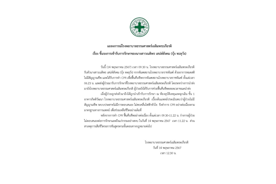 เมื่อวันที่ 14 พ.ค.67 โรงพยาบาลธรรมศาสตร์เฉลิมพระเกียรติ ออกแถลงการณ์เรื่อง ชี้แจงการเข้ารับการรักษาของนางสาวเนติพร เสน่ห์สังคม (บุ้ง ทะลุวัง) ระบุว่าวันนี้ (14 พฤษภาคม 2567) เวลา 09.30 น. โรงพยาบาลธรรมศาสตร์เฉลิมพระเกียรติ รับตัวนางสาวเนติพร เสน่ห์สังคม (บุ้ง ทะลุวัง) จากทัณฑสถานโรงพยาบาลราชทัณฑ์ ด้วยอาการหมดสติไม่มีสัญญาณชีพ และได้รับการทำ CPR เพื่อฟื้นคืนชีพจากทัณฑสถานโรงพยาบาลราชทัณฑ์ ตั้งแต่เวลา 06.23 น. และส่งผู้ป่วยมารับการรักษาที่โรงพยาบาลธรรมศาสตร์เฉลิมพระเกียรติ โดยระหว่างการนำส่งมายังโรงพยาบาลธรรมศาสตร์เฉลิมพระเกียรติ ผู้ป่วยยังได้รับการช่วยฟื้นคืนชีพตลอตเวลาขณะนำส่ง