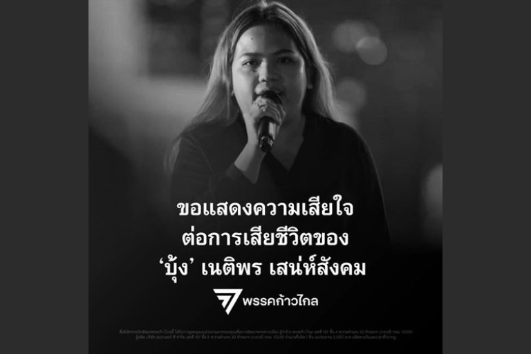 ล่าสุด ทางเพจเฟซบุ๊กของพรรคก้าวไกล ได้โพสต์ข้อความระบุว่า...พรรคก้าวไกลขอแสดงความเสียใจต่อการเสียชีวิตของคุณเนติพร เสน่ห์สังคม (บุ้ง) นักกิจกรรมทางการเมืองกลุ่มทะลุวัง