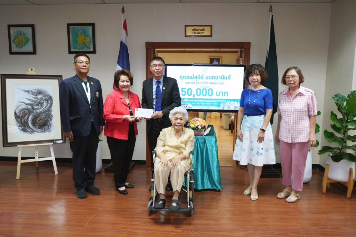 ผศ.ดร.นุชนาถ มั่งคั่ง รองอธิการบดีฝ่ายการเงินและทรัพย์สิน มหาวิทยาลัยเกษตรศาสตร์ รับมอบเงินบริจาคจำนวน 50,000 บาท จาก คุณแม่สุนีย์ นนทนานันท์ และ รศ.ดร.ศุภกิจ นนทนานันท์ เพื่อสนับสนุนคณะแพทยศาสตร์และโรงพยาบาลมหาวิทยาลัยเกษตรศาสตร์ โอกาสนี้ ผศ.น.สพ.ดร.เสรี กุญแจนาค รองอธิการบดีวิทยาเขตศรีราชา มหาวิทยาลัยเกษตรศาสตร์ ร่วมเป็นสักขีพยาน เมื่อวันที่ 15 พฤษภาคม 2567 ณ อาคารสารนิเทศ 50 ปี มหาวิทยาลัยเกษตรศาสตร์