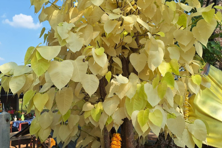 วันนี้ (15 พ.ค.67) ผู้สื่อข่าวรายงานว่า มีชาวเน็ตโพสต์แจ้งว่า ที่ทุ่งนาท้ายหมู่บ้านบ้านนาพูนทรัพย์ ต.บ้านธาตุ อ.เพ็ญ จ.อุดรธานี มีต้นโพธิ์ประหลาด มีใบเป็นสีทองอย่างสวยงามทั้งต้น อยากให้แวะไปดูกับตาเพราะสวยงามมาก ใบสีทองเหลืองอร่ามทุกใบสวยงามทั้งต้น อาจจะไม่ใช่เป็นปาฏิหาริย์แต่เป็นความศรัทธา 1 ปีจะมี 1 ครั้งก่อนที่ใบจะร่วงโรยราไปในเดือน พ.ค.- มิ.ย.ที่จะถึงนี้ ต่อมาผู้สื่อข่าวเดินทางไปตรงต้นโพธิ์ใบสีทองแห่งนี้ โดยพบว่า พบว่าต้นโพธิ์ใบสีทองเป็นต้นเล็กเกิดข้างต้นโพธิ์ขนาดใหญ่ที่มีลักษณะเอียง 45 องศาแต่ไม่ล้ม โดยชาวบ้านบอกว่าอายุต้นโพธิ์ใหญ่ต้นนี้มีอายุมากกว่า 300 ปีแล้ว ส่วนต้นโพธิ์เล็กที่มีลักษณะต้นโพธิ์มีใบสีเหลืองทองทั้งต้นไม่มีสีเขียวแม้แต่ใบเดียว แต่ทุกใบเป็นสีเหลืองทองสวยอร่าม นับได้มากกว่า 500 ใบ จนชาวบ้านเรียกว่าต้นโพธิ์ทอง และให้การเคารพบูชา เชื่อว่าเป็นต้นไม้ศักดิ์สิทธิ์และมีสิ่งศักดิ์สิทธิ์อยู่ตรงนี้ด้วย