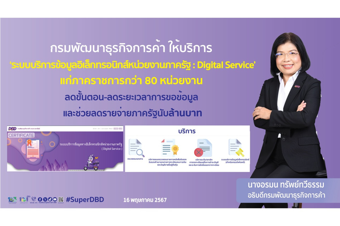 นอกจากนี้ที่ผ่านมา มีหน่วยงานภาครัฐที่เชื่อมโยงข้อมูลกับกรมพัฒนาธุรกิจการค้าแล้ว 169 หน่วยงาน และได้มีการใช้บริการข้อมูลรวมถึง 52 ล้านรายการ ช่วยประหยัดต้นทุนของประชาชนและผู้ประกอบการได้ถึงปีละ 7,000 ล้านบาท ซึ่งกรมฯ หอการค้าไทยฯ และ สำนักงาน ก.พ.ร. ได้ร่วมกันแถลงข่าวประกาศความสำเร็จการเชื่อมโยงข้อมูลนิติบุคคลผ่านระบบอิเล็กทรอนิกส์ ไม่ต้องเซ็นสำเนา ไม่ต้องเรียกเอกสาร ลดภาระซ้ำซ้อน ไปเมื่อวันอังคารที่ 23 เมษายน 2567 หน่วยงานภาครัฐที่สนใจสมัครและใช้บริการระบบ Digital Service สอบถามรายละเอียดเพิ่มเติมได้ที่ ส่วนบริการหน่วยราชการ กองข้อมูลธุรกิจ กรมพัฒนาธุรกิจการค้า กระทรวงพาณิชย์ โทร 0 2547 4366 สายด่วน 1570 e-Mail: document_govt@dbd.go.th และ www.dbd.go.th