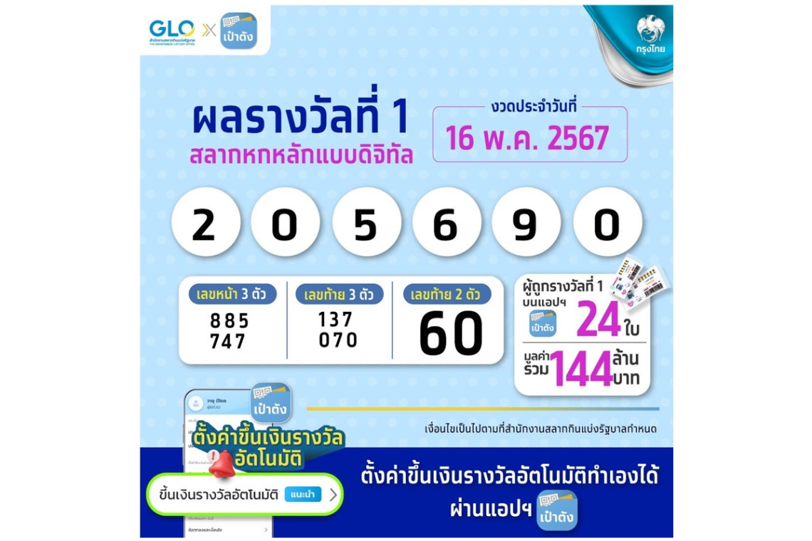 สลากดิจิทัล บนแอปฯเป๋าตัง ของธนาคารกรุงไทย งวด 16 พ.ค. 67 รางวัลที่ 1 เลขที่ 205690 จำนวนใบที่ถูกทั้งหมด 24 ใบ รวมเป็นเงินรางวัล 144 ล้านบาท