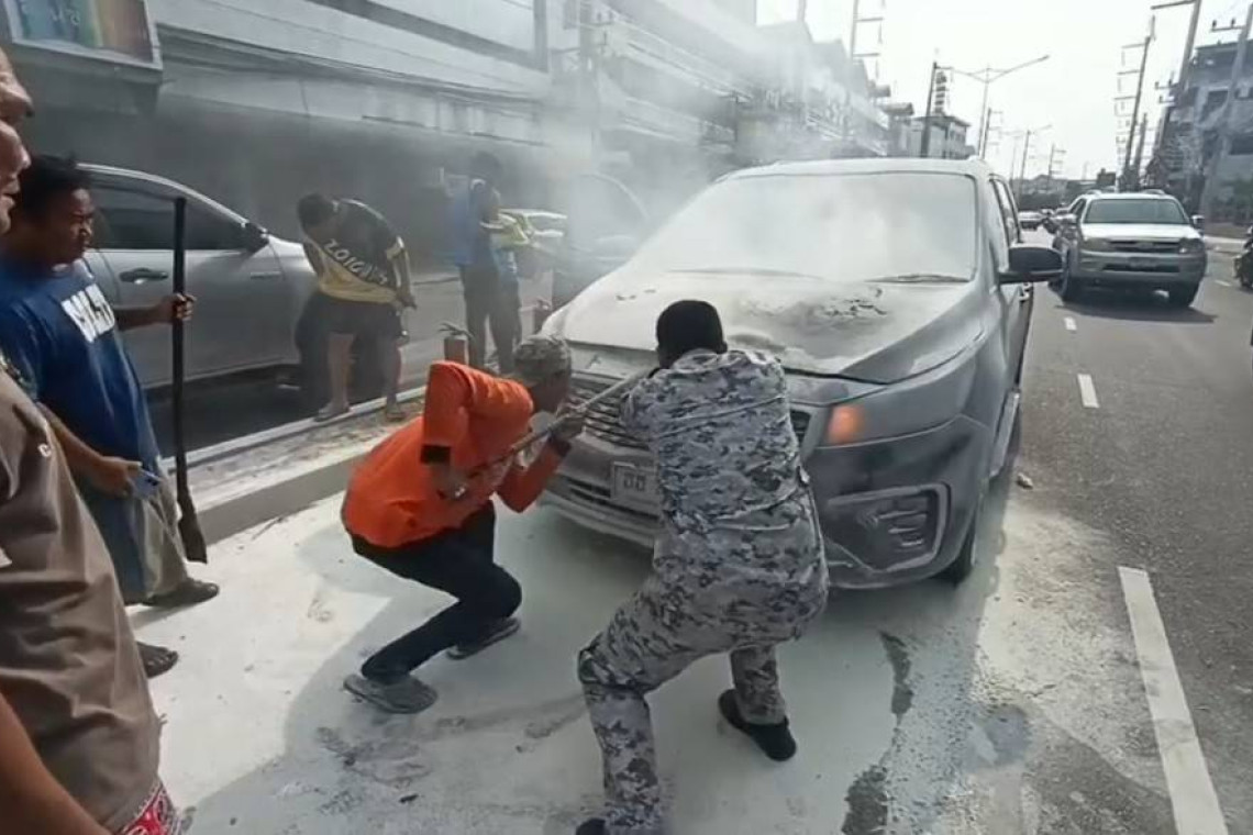 ในที่เกิดเหตุ บริเวณกลางถนนฝั่งเข้าหาดจอมเทียนใกล้เคียงตลาดควาย กลางเมืองพัทยา พบรถยนต์แวน ยี่ห้อเกีย สีดำ ทะเบียน ฮฮ xxxx กทม. สภาพห้องเครื่องยังมีกลุ่มควันพวยพุ่งออกมา โดยมี พ.จ.อ.พีรพัฒน์ นพศิริ ช่างไฟฟ้าอาวุธ เรือหลวงนเรศวร กองเรือฟรีเกตที่ 2 กองเรือยุทธการ และชาวบ้านใช้ถังดับเพลิงเคมีช่วยกันดับไฟ จากนั้นจึงพยายามช่วยกันเปิดฝากระโปรงรถออก เพื่อดับไฟอีกครั้ง
