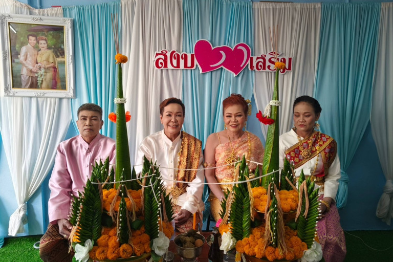 นางศรีประไพ อิสาน หรือ คุณสงบ ซึ่งเป็นเจ้าสาว เปิดเผยว่า ก่อนหน้านี้ตนเคยแต่งงานอยู่กับแฟนซึ่งเป็นผู้ชาย ตามปกติ จนมีลูกด้วยกัน 3 คน ก่อนจะหย่าร้างกันไปนานหลายปีแล้ว ซึ่งหลังหย่าร้างกันแล้ว ตนก็ได้ใช้ชีวิตตามปกติ ทำธุรกิจเย็บผ้า จนมาได้เจอกับ พี่เสริม (เจ้าบ่าว) และได้ทำงานร่วมกัน ตอนนี้รู้สึกว่า พี่เสริม เป็นคนดี ขยะทำงาน เอาใจใส่ดี เลยตัดสินใจคบหากัน และก็คบหากันมานานประมาณ 5 ปี จนกระทั่งความรักจะสุกงอม และได้ตัดสินใจแต่งงานกันในที่สุด โดยไม่สนว่าจะแต่งงานกับเพศหญิงหรือเพศชาย ตนถือเอาความสบายใจ และอีกฝ่ายจะสามารถดูแลตัวเองได้หรือไม่ก็พอแล้ว