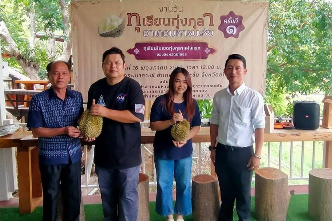 นายนพดล ผุดผ่อง เกษตรจังหวัด กล่าวว่า จังหวัดยโสธร มีสวนทุเรียนที่ให้ผลผลิตในปี 2567 แล้วประมาณ 10 สวน ในพื้นที่หลายอำเภอ เช่น อำเภอเลิงนกทา อำเภอกุดชุม อำเภอเมือง อำเภอมหาชนะชัย เป็นต้น โดยเร็วๆ นี้ จะจัดกิจกรรมแลกเปลี่ยนเรียนรู้เจ้าของสวนทุเรียนในจังหวัดยโสธร เพื่อหาแนวทางในการส่งเสริมและพัฒนาทุเรียนของจังหวัดยโสธรให้เป็นที่รู้จักมากยิ่งขึ้น ในส่วนของสวนทุเรียนทรายทอง ของนางทอง ประสมสืบ ม.3 บ้านพลไว ตำบลคูเมือง อำเภอมหาชนะชัย ตั้งอยู่ในเขตพื้นที่ทุ่งกุลาร้องไห้ ซึ่งในจังหวัดยโสธร มีเพียง 2 อำเภอที่อยู่ในพื้นที่ทุ่งกุลาร้องไห้ ได้แก่ อำเภอมหาชนะชัยและอำเภอค้อวัง ของจังหวัดยโสธร ทำให้ทุเรียนที่ได้มีลักษณะพิเศษเป็นเอกลักษณ์เฉพาะ เนื้อทุเรียนจะเนียน มีความละมุน กรอบนอกนุ่มใน กลิ่นไม่แรง และที่สำคัญเมล็ดเล็ก