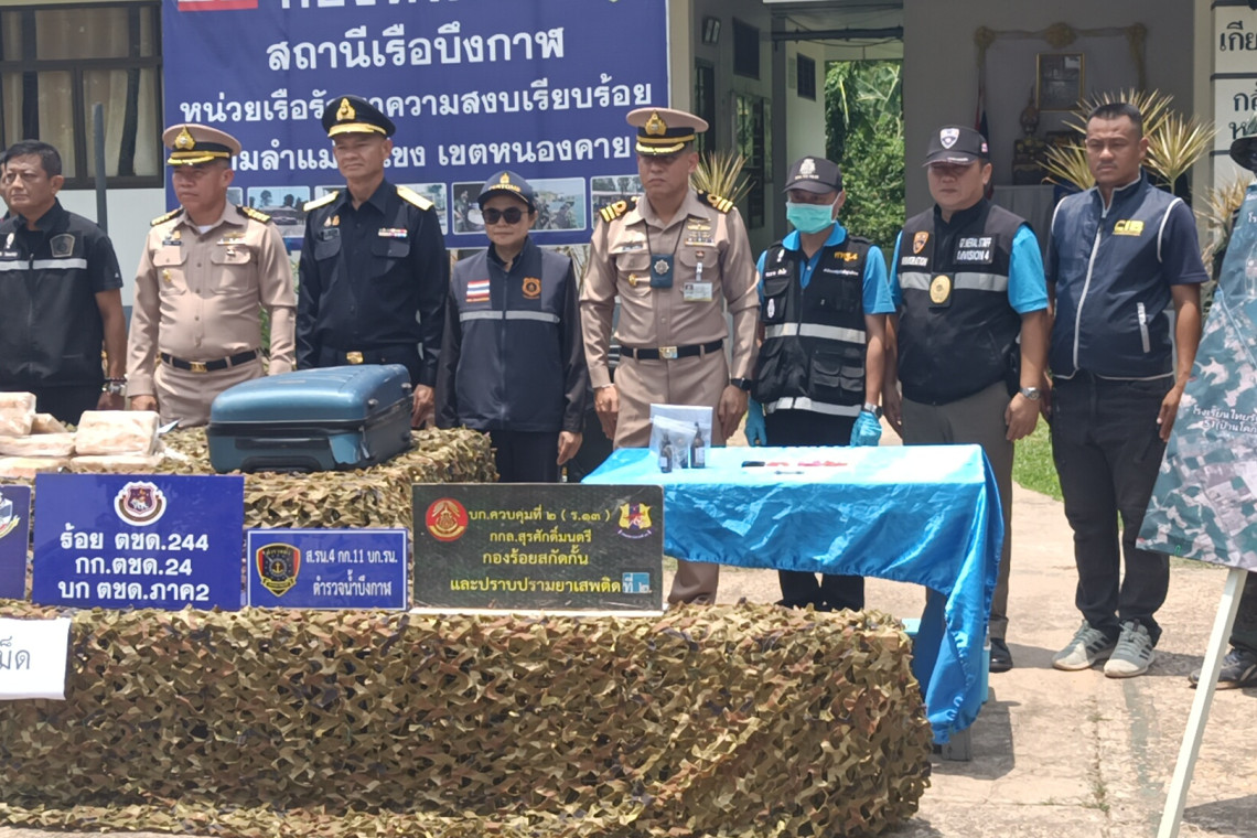 เมื่อเวลา 11.30 น.วันที 17 พ.ค.ที่หน่วยเรือรักษาความสงบเรียบร้อยตามลำแม่น้ำโขง บก.สน.เรือบึงกาฬ ต.วิศิษฐ์ อ.เมืองบึงกาฬ จ.บึงกาฬ โดย พล.ร.ต.นรินทร์ ขาวเจริญ ผบ.นรข. มอบหมายให้ น.อ.พิชัยยุทธ ปาจะกัง หน.ยก.-ขว. นรข.เขตหนองคาย เป็นผู้แทนในการแถลงข่าวการตรวจยึดยาเสพติดให้โทษประเภท 1 (ยาบ้า) จำนวนประมาณ 102,000 เม็ด โดยมี น.ท.ธนชัย รอดทัศนา หน.สน.เรือบึงกาฬ พร้อมด้วยหัวหน้าหน่วยงานความมั่นคงในพื้นที่ประกอบไปด้วย พ.ต.อ.ธานินทร์ ผิวละเอียด ผกก.สภ.บุ่งคล้า ว่าที่ พ.ต.อ.จตุพร เนวะมาตย์ ผกก.ตม.จว.บึงกาฬ พ.ต.ท.สุชาติ วิทยะเจษฎา รอง ผกก.สส.ภ.จว.บึงกาฬ พ.ต.ท.เทอดศักดิ์ โคตรศรีวงษ์ ผบ.ร้อย ตชด.244 นายนายขจรศักดิ์ พรหมเทพ ผช.ป้องกันจังหวัดฯ กรณ์ชัย ปัญญาวัฒนพงศ์ นายด่านศุลกากรบึงกาฬ ร่วมแถลงข่าวในครั้งนี้