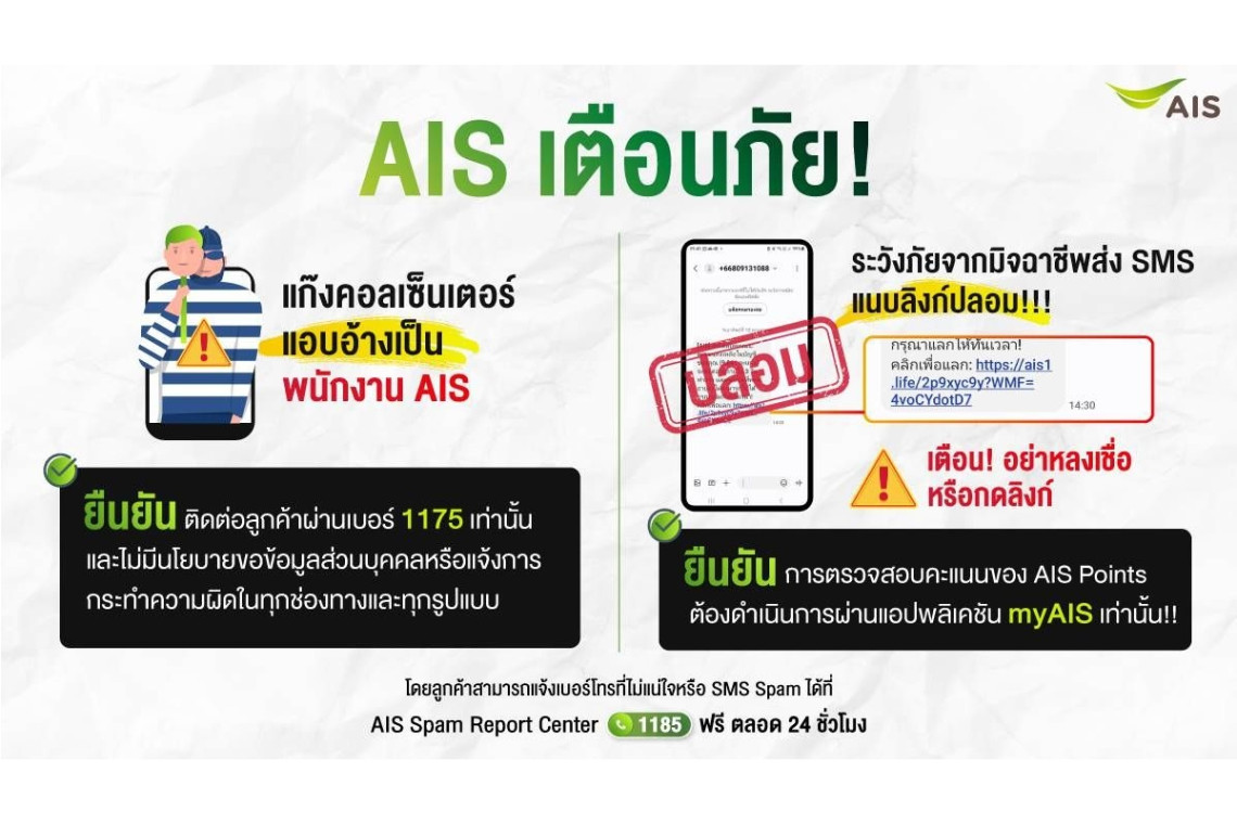 SMS ข้อความสแปม แนบลิงก์ปลอม ลวงให้กด โดยมิจฉาชีพแอบอ้างชื่อผู้ส่ง (Sender Name) เป็นเบอร์มือถือ หรือ SMS หรือ AIS เป็นข้อความในลักษณะว่า “...คะแนนเอไอเอส พอยท์ของลูกค้ากำลังจะหมดอายุภายใน 3 วัน ให้รีบดำเนินการแลกคะแนน...” จากนั้นแนบลิงก์ให้กดไปยังเว็บไซต์ปลอม เพื่อหลอกขอข้อมูลสำคัญของลูกค้าอันอาจนำไปสู่ความเสี่ยงในการสูญเสียทรัพย์สิน หรือ ความเสียหายอื่นๆ ซึ่ง บริษัทฯ ขอยืนยันว่าการสื่อสารในส่วนของการตรวจสอบ หรือ แลกคะแนนของเอไอเอส พอยท์ สามารถทำได้บนช่องทางแอปพลิเคชัน myAIS เท่านั้น บริษัทฯ ไม่มีนโยบายส่ง SMS เพื่อให้ลูกค้ากรอกข้อมูลส่วนบุคคลหรือเกี่ยวข้องกับการทำธุรกรรมแต่อย่างใด